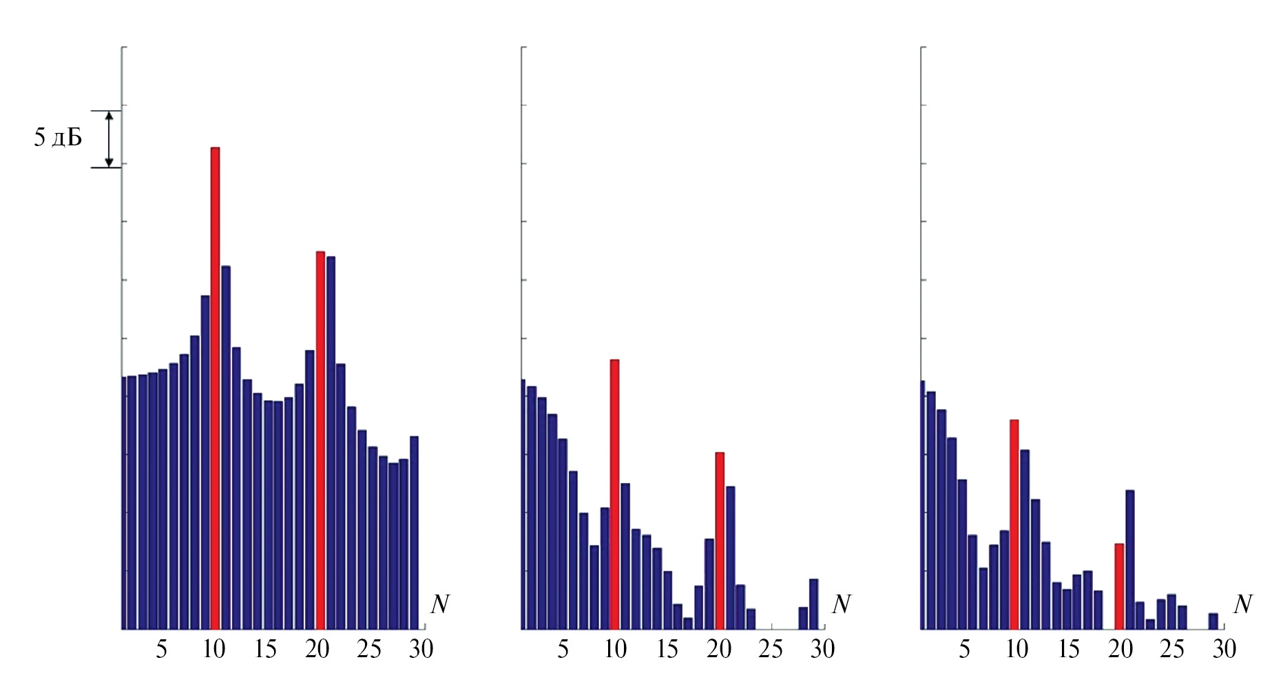 Рис. 5. Эволюция спектра регулярной системы волн ( N – номер гармоники с частотой Nω₀, , T – период вращения вентилятора).