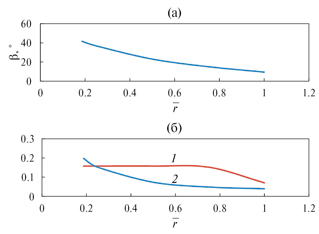 Рис. 4. (а) — Распределение местного угла установки лопасти β вдоль радиуса; (б) — распределение относительной хорды (1) и относительной толщины (2) профиля вдоль радиуса