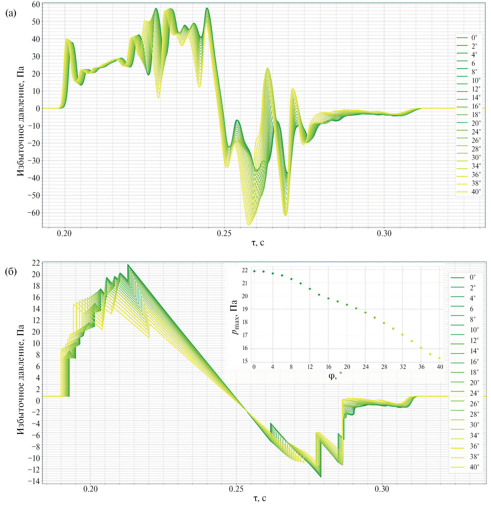 Рис. 6. (а) — Начальные эпюры избыточного давления и (б) — соответствующие эпюры на земле для различных азимутальных углов выхода лучей