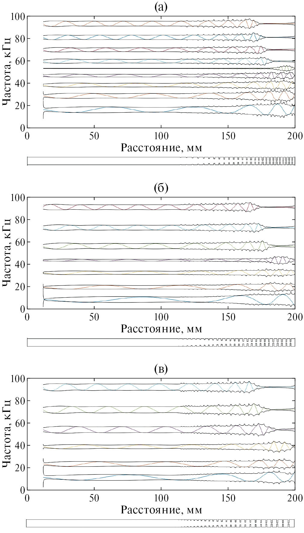 Для образцов № 1, 2 и 3 с помощью численного моделирования были определены собственные частоты и формы мод изгибных волн в диапазоне частот 1−100 кГц. С помощью преобразования Гильберта были рассчитаны функции, ортогональные исходным модам и восстановлены формы огибающих для этих мод. Распределение амплитуды некоторых изгибных мод вместе с соответствующими огибающими вдоль центральной линии поверхности стержня представлены на рис. 3. Частота каждой моды отображается на оси ординат таким образом, что ноль амплитуды колебаний моды соответствует значению ее собственной частоты. Под каждым графиком находится профиль образца стержня, которому соответствуют рассчитанные моды.