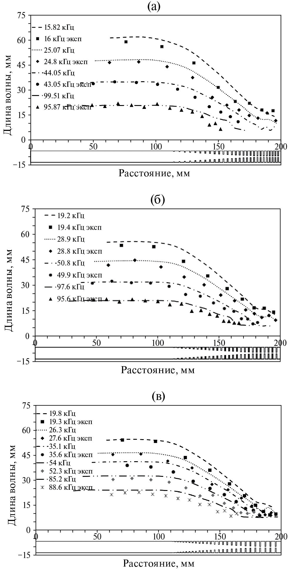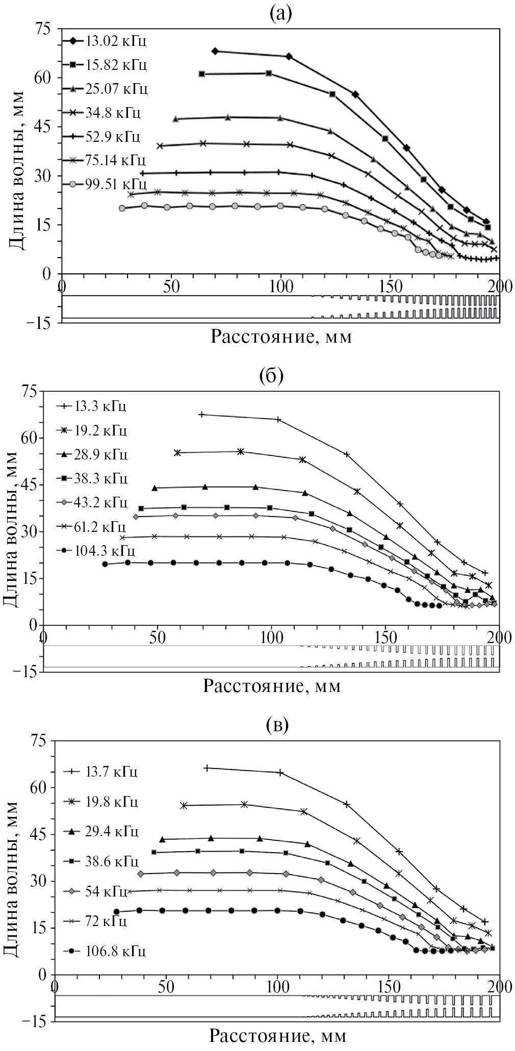 Для образца № 1 значение минимальной длины волны достигается при частоте особой моды 52.9 кГц и равно 4.8 мм. В образце № 2 минимальное значение длины волны составило 6.0 мм и достигается при частоте особой моды 43.2 кГц. В образце № 3 минимальное значение длины волны равно 7.7 мм и достигается на частоте 38.1 кГц также для особой моды. Таким образом, самое сильное замедление волны происходит в образце, где количество прорезей увеличивается к его торцу.