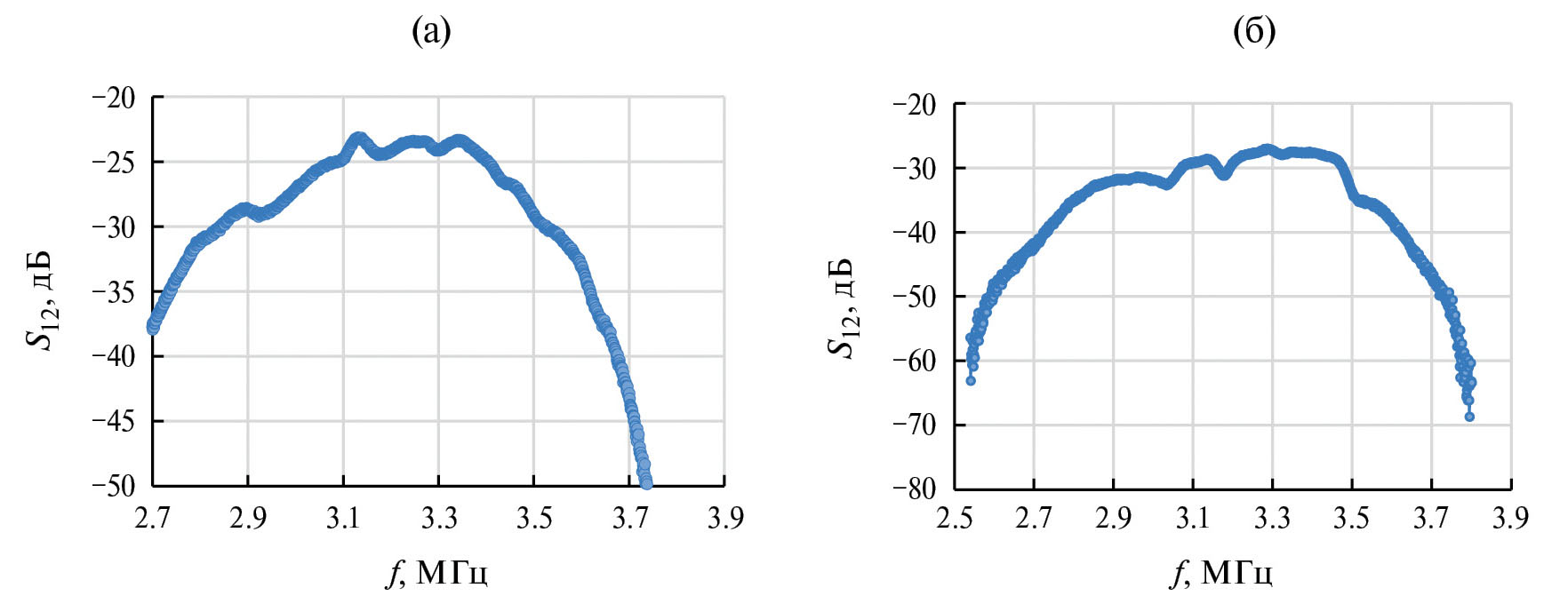 Рис. 2. Частотные зависимости полных потерь S12 для соединенных линий задержки, при расстоянии между ВШП (а) – 8 мм и (б) – 18 мм