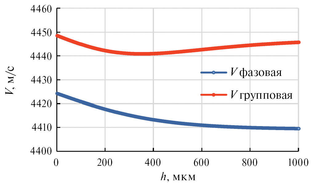 Была также проведена теоретическая оценка фазовой и групповой скорости щелевой моды с поперечно-горизонтальной поляризацией. Две пластины ниобата лития Y-среза толщиной 0.2 мм располагались друг над другом с некоторым зазором h. Кристаллографические оси X были параллельны друг другу. В качестве исходных уравнений использовались уравнение движения, уравнение Лапласа и материальные уравнения для механического напряжения и электрической индукции в пьезоэлектрической среде [9]. Использовались также электрические граничные условия: непрерывность электрического потенциала и нормальной компоненты электрической индукции на границах раздела кристалл–вакуум. В качестве механического граничного условия использовалось равенство нулю всех компонент механического напряжения на границах кристалл–вакуум. Решением являлась плоская неоднородная волна, распространяющаяся в направлении оси X. Рассматривалась двумерная задача, т.е. в направлении оси Z все величины считались постоянными. Было установлено, что для выбранной кристаллографической ситуации пьезоактивной является волна с поперечно–горизонтальной поляризацией нулевого порядка. В результате были найдены зависимости фазовой и групповой скоростей от величины зазора, которые представлены на рис. 7. Видно, что с увеличением ширины зазора от 1 до 1000 мкм фазовая скорость монотонно уменьшается от 4424 м/с до 4409 м/с. При этом групповая скорость уменьшается от 4448 м/с до 4440 м/с и затем возрастает до 4445 м/с.