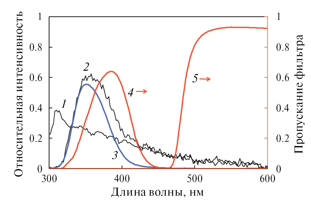Рис. 3. Спектры СЛ воды (1), 0.1 M CeCl3 (2), люминесценции 0.1 M CeCl3 (3) и спектры пропускания фиолетового (4) и желтого (5) светофильтров