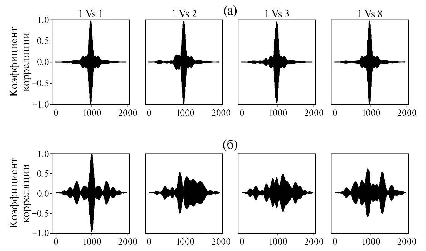 Рис. 10. Корреляционная функция сигналов, полученных в 1-ом цикле и в последующих циклах. Первый столбец — автокорреляции. (а) — Прямые сигналы, (б) — эхосигналы от сипа. Частота сигнала 2.5 кГц, частота дискретизации 24 кГц