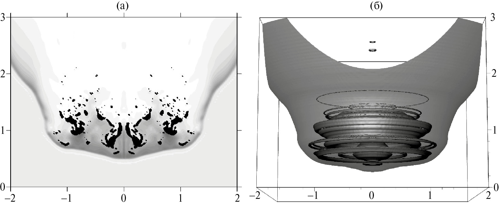 - В осесимметричной постановке разлетающиеся “обломки” фрагментированного тела удаляются от оси симметрии в виде торов с осью вращения вдоль траектории падающего тела. В качестве примера на рис. 5 показана картина разрушения астероида при торможении в двумерной осесимметричной постановке. На панели (а) показано двумерное распределение плотности в плоскости, проходящей через траекторию тела, на панели (б) – соответствующая ему трехмерная картинка. Сохранение массы (объема) “тороидального обломка” при удалении от оси симметрии приводит к тому, что “мидель” тора увеличивается. Соответственно, усиливается его торможение в набегающем потоке. Это может существенно изменить высоту и характер выделения энергии в атмосфере, а также ударное воздействие на поверхность.