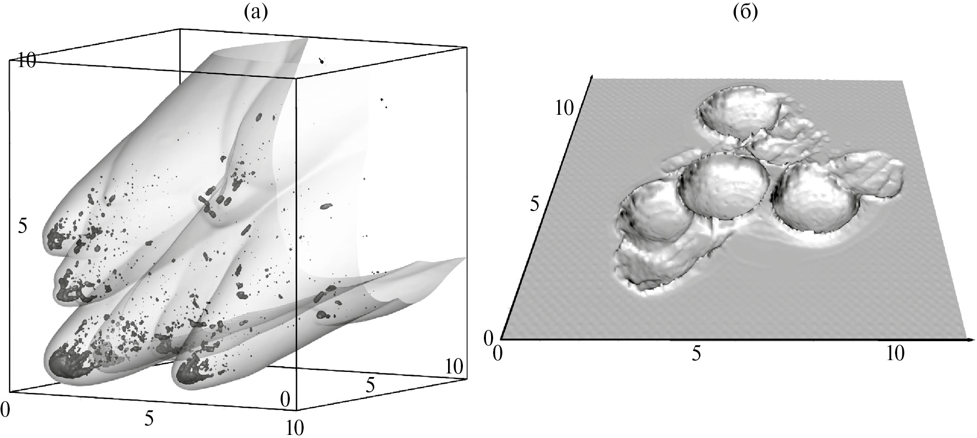 Рис. 5. Полученные в двумерном расчете двумерная и трехмерная картинки облака фрагментов, образующегося при падении астероида диаметром 1 км, падающего под углом 45º в атмосфере Венеры: (а) – в плоскости, проходящей через траекторию, серым цветом показано распределение относительной плотности атмосферного газа (чем темнее, тем выше плотность), черным – фрагменты астероида; (б) – то же облако фрагментов показано в трехмерной геометрии (светло-серая поверхность соответствует фронту ударной волны, темно-серым цветом показано вещество разрушенного астероида). Рисунки соответствуют высоте 15 км. По осям координат указаны расстояния в километрах.
