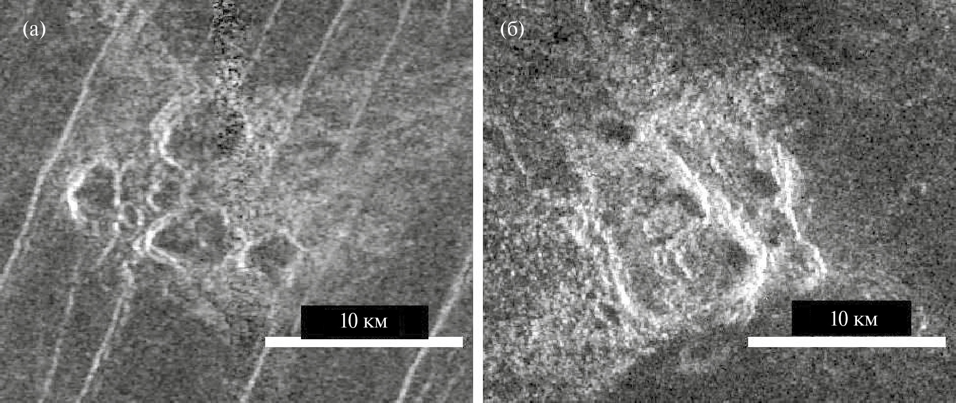 Рис. 8. Радарные изображения кластеров кратеров на Венере: (а) – безымянный кластер, 126 в. д., 46.3 ю. ш. (№ 642 в каталоге); (б) – кластер Qulzhan, 165.4. в. д., 23.5 с. ш. (№ 610 в каталоге). Изображения построены с помощью программы JMars (https://jmars.asu.edu/).