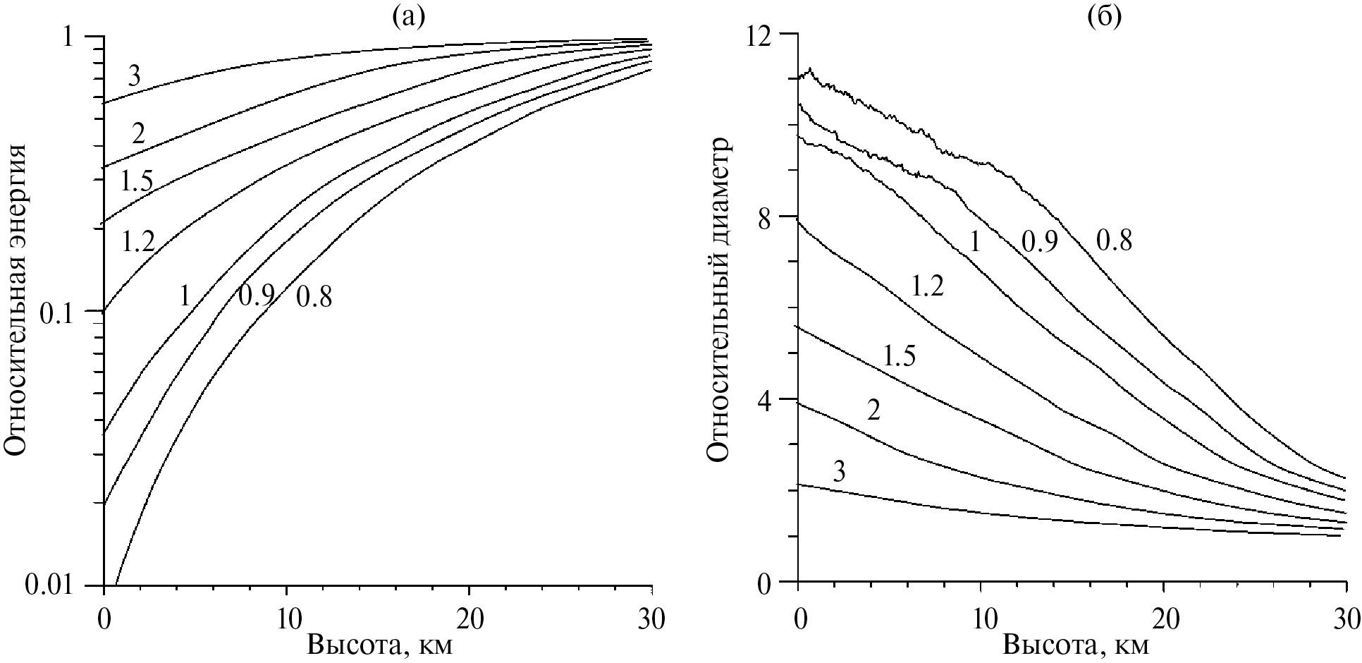 Рис. 9. Зависимости от высоты при падении астероидов разного диаметра D0 (на графиках около каждой кривой указаны значения D0 в километрах) под углом 45º: (а) – энергии астероида E/E0; (б) – эффективного диаметра астероида D/D0.