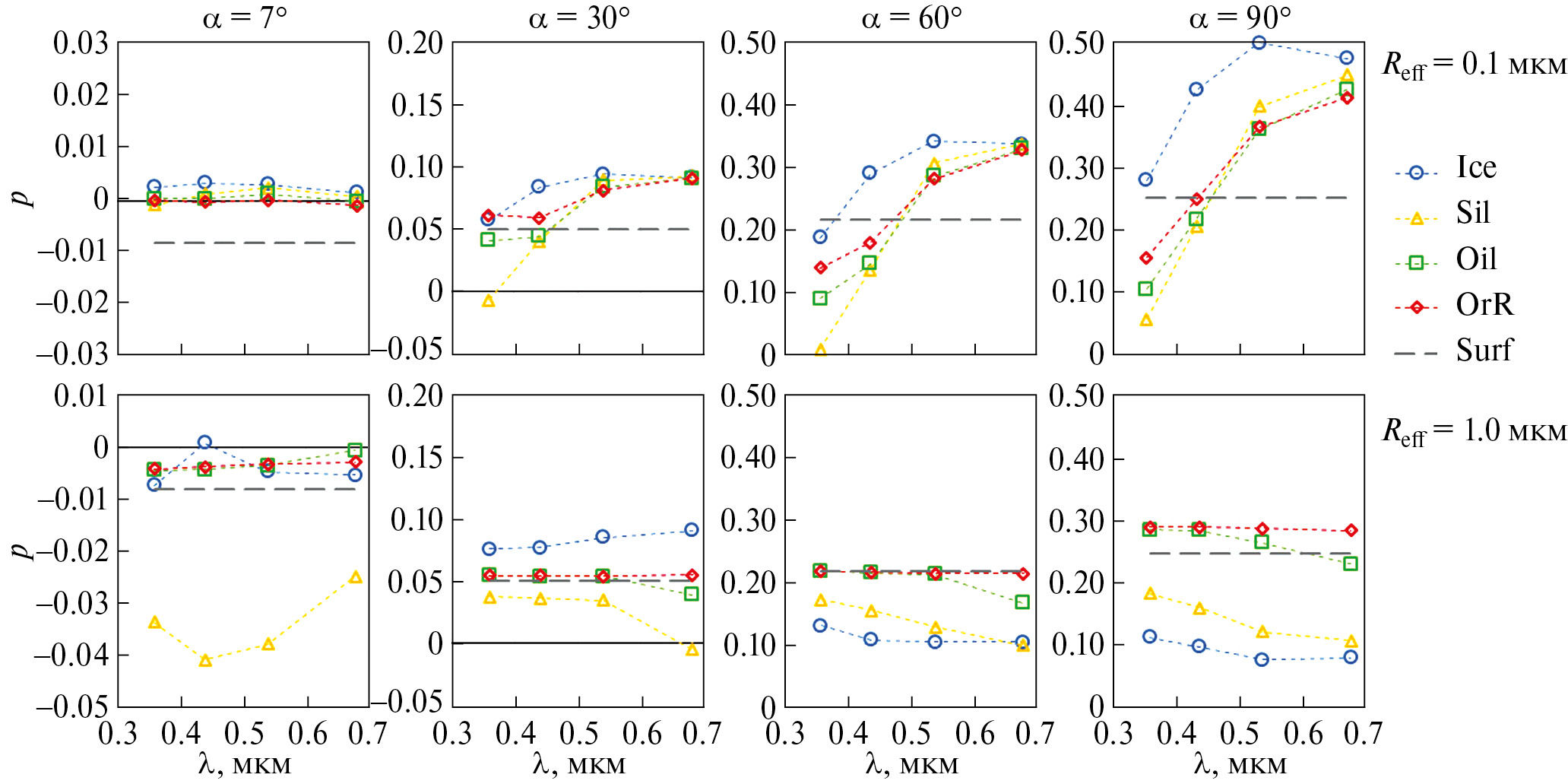 Рис. 4. Изменение степени линейной поляризации света P, отраженного модельным астероидом с экзосферой, вдоль спектра на фазовых углах α = 7°, 30°, 60° и 90°. Частицы в экзосфере – смеси случайно ориентированных сфероидов при Reff = 0.1 (верхний ряд диаграмм) и 1.0 мкм (нижний ряд диаграмм), νeff = 0.05 и E = 0.7–1.3. Показаны модели для частиц указанного состава, а также модель для астероида без экзосферы (“Surf”). Оптическая толщина экзосферы принята равной τ = 0.5 на λ = 0.54 мкм.