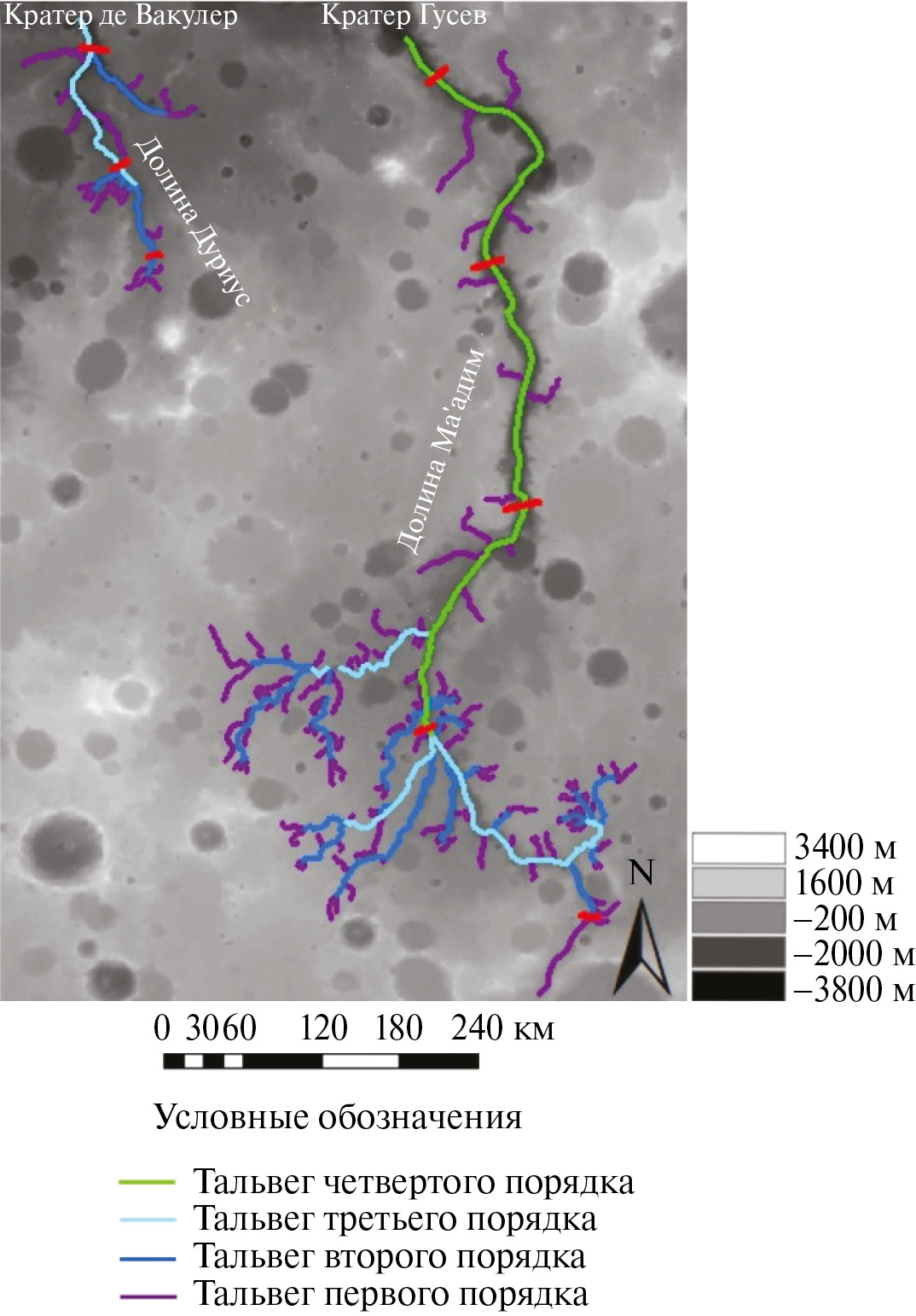 В качестве дешифровочных признаков долинных форм использовался набор характеристик, которые помогли идентифицировать и описать данный тип рельефа. Так, например, узкие и глубокие долины свидетельствуют о том, что условия формирования такого рода форм существовали короткое время, но с активными процессами врезания. Широкие долины свидетельствуют о продолжительном времени их формирования. В некоторых случаях долины имеют довольно четкий облик, по которому можно определить их структуру, рисунок и морфологию. Так, и в системе долин Ма’адим, и в системе долин Дуриус по форме, размеру и альбедо отчетливо выделяются главные долины и их притоки. В ходе дешифрирования было проведено кодирование структуры долинной сети. При этом использовалась система определения порядка долин Штралера (Strahler, 1957), где каждый приток реки классифицируется в соответствии с его положением в общей сети. Были получены основные характеристики сети: длины долин, их ширина, уклон, а также морфологические характеристики долин: продольный профиль, глубина и ширина по бровкам и днищу, форма поперечного профиля. Анализировалось также изменение формы и параметров поперечного профиля вниз по долинам для выяснения закономерностей развития долин.