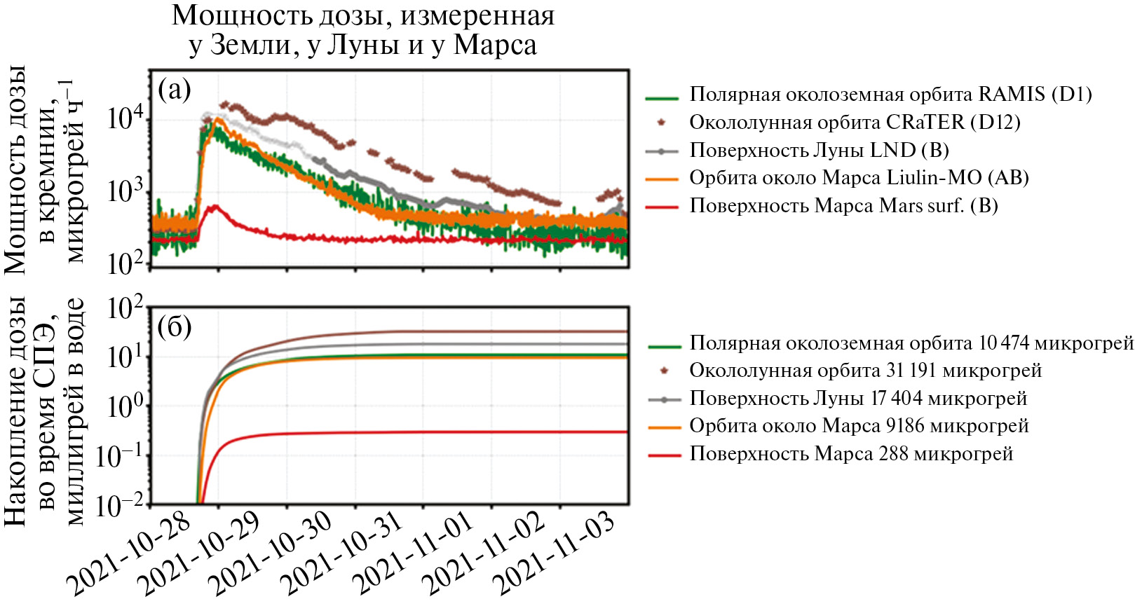 Во время СПС 28 октября 2021 г. были зарегистрированы дозы космической радиации сразу на нескольких космических аппаратах: на полярной орбите у Земли прибором RAMIS, на лунной поверхности с прибором LND и на лунной орбите с прибором CRaTER, на поверхности Марса с прибором RAD и на орбите вокруг Марса с прибором Liulin-MO (Guo и др., 2023). На рис. 8 представлены взятые из этой работы данные о мощности дозы, измеренные с указанными приборами, а также динамика накопления дозы в ходе СПС. В табл. 2 представлены значения доз в воде, накопленных за все событие.