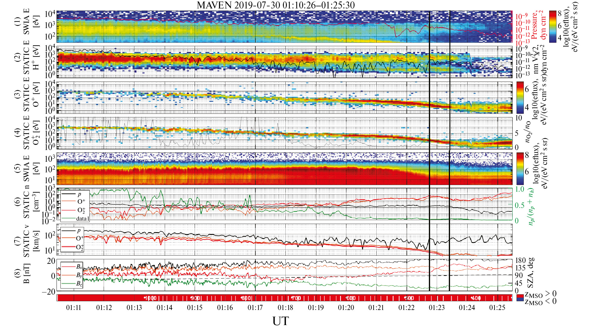 Рис. 5. 4 августа 2019 г., в 05:20:47 – 05:24:22 по восточному времени. Данные MAVEN включают магнитослой, магнитопаузу, магнитосферу и ионосферу. Панели сверху вниз: 1 – дифференциальная энергия-время суммы всех ионов; 2 – дифференциальная энергия-время протонов H+; 3 – дифференциальная энергия-время кислорода O+; 4 – энергия-время кислорода O2+; 5 – дифференциальная энергия-время энергии электронов; 6 – цветные линии плотности ионов (в прямоугольнике справа) и а относительная плотность ионов и протонов (линии зеленого цвета); 7 – скорости трех ионов (пояснение в прямоугольнике справа); 8 – компоненты магнитного пола в системе координат Солнечной орбиты, ориентированной на Марс (MSO) пояснения цветов указаны справа, и величина магнитного поля (черная линия). Красная цветовая полоска внизу показывает, что спутник находится в северном полушарии. Вертикальные черные полосы приближенно показывают область магнитопаузы. Сектор между двумя вертикальными линиями указывает место, где происходит вращение магнитного поля.