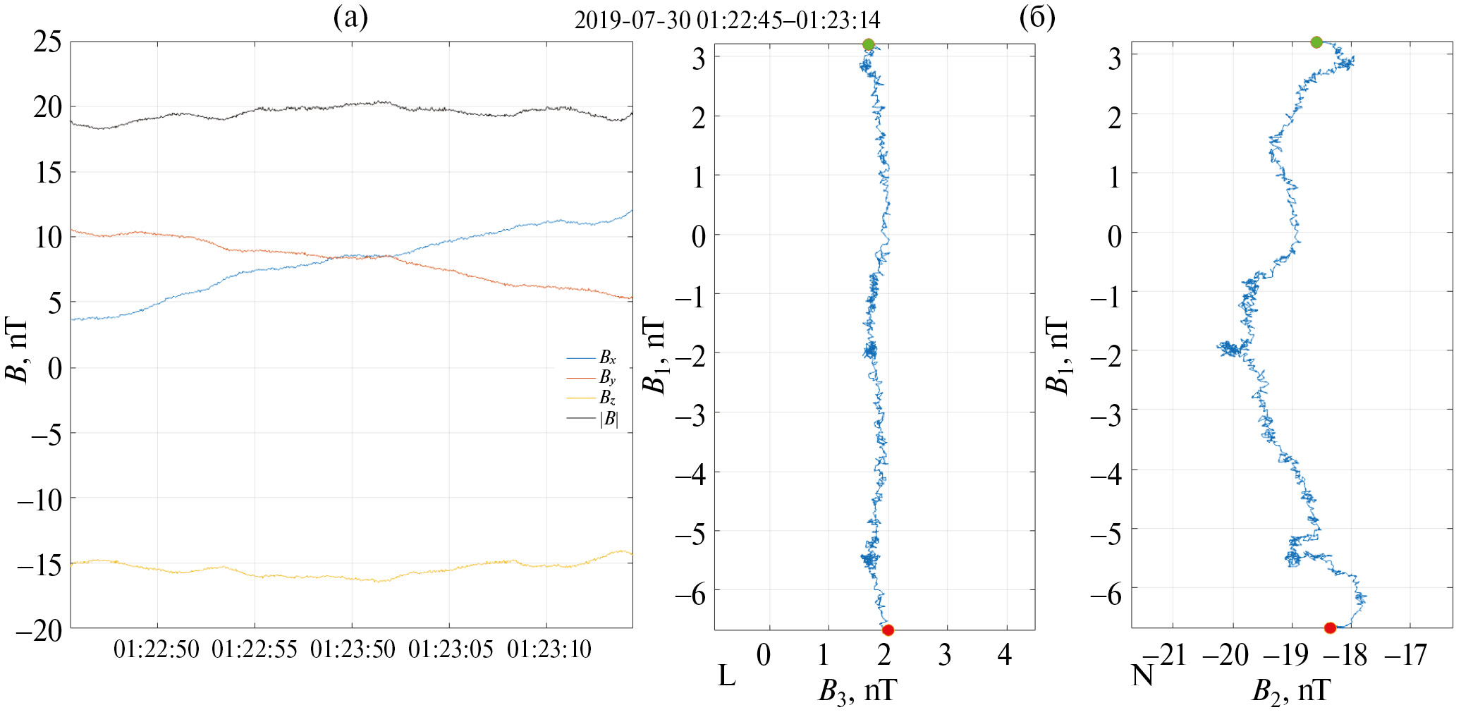 На рис. 2 показан результат минимального анализа магнитного поля (Sönnerup, Scheible, 1998) с целью определения характеристики данного явления, когда оси определяются по трем основным ортогональным осям.