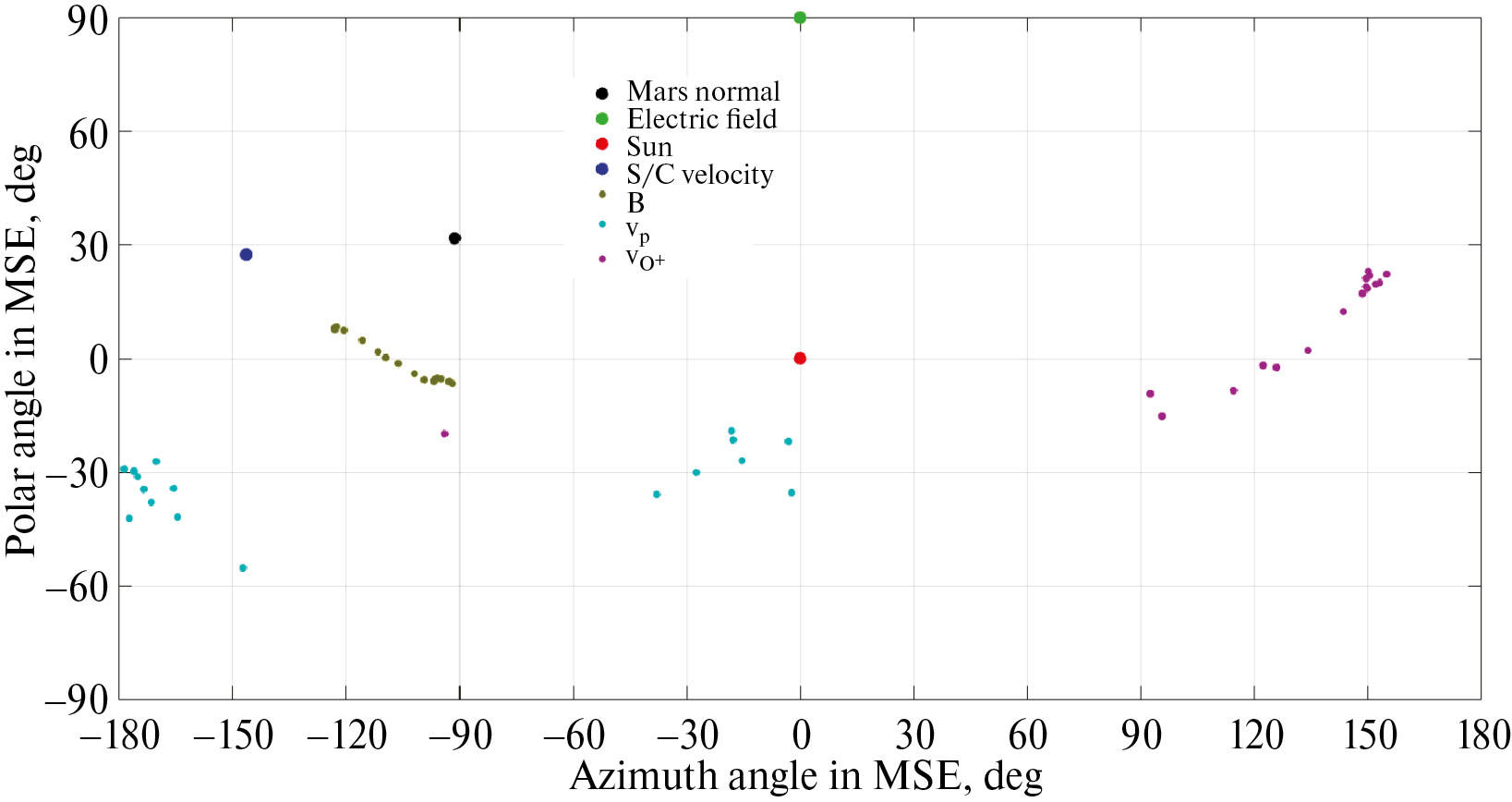 Так же, как в случае рис. 1, спутник находится в области, где электрическое поле направлено в сторону Марса. Космический аппарат находился в MSE и на SZA 78° с часовым углом ~180°.