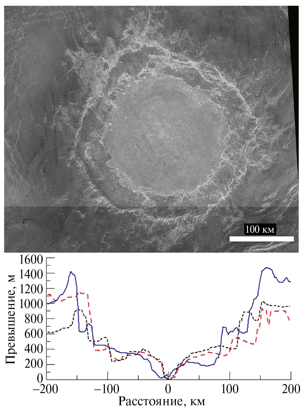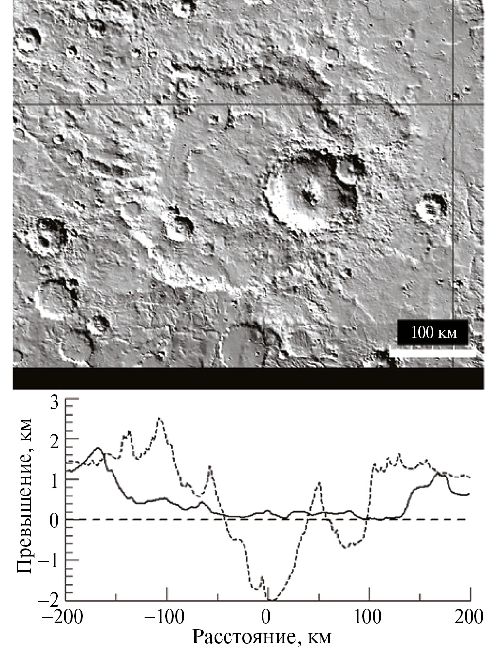 Некоторое представление о том, как выглядят сохранившиеся крупные ударные кратеры, можно получить по изображениям и топографии кратеров Меркурия и Марса (рис. 2, рис. 3). Однако примерно в три раза меньшая сила тяжести на этих планетах требует дополнительного обсуждения геометрии больших кратеров. Профиль кратера на Марсе (рис. 3) сильно изменен более молодыми геологическими процессами, включая образование более молодых кратеров, однако положение внутреннего кольца все еще заметно. Для иллюстрации того, каким мог быть начальный профиль кратера, на нижнем рисунке пунктиром показан профиль более молодого и лучше сохранившегося кратера Лио (Lyot, D ~ 200 км) глубиной ~4 км, сравнимой с глубиной кратера на Меркурии, показанного на рис. 2.