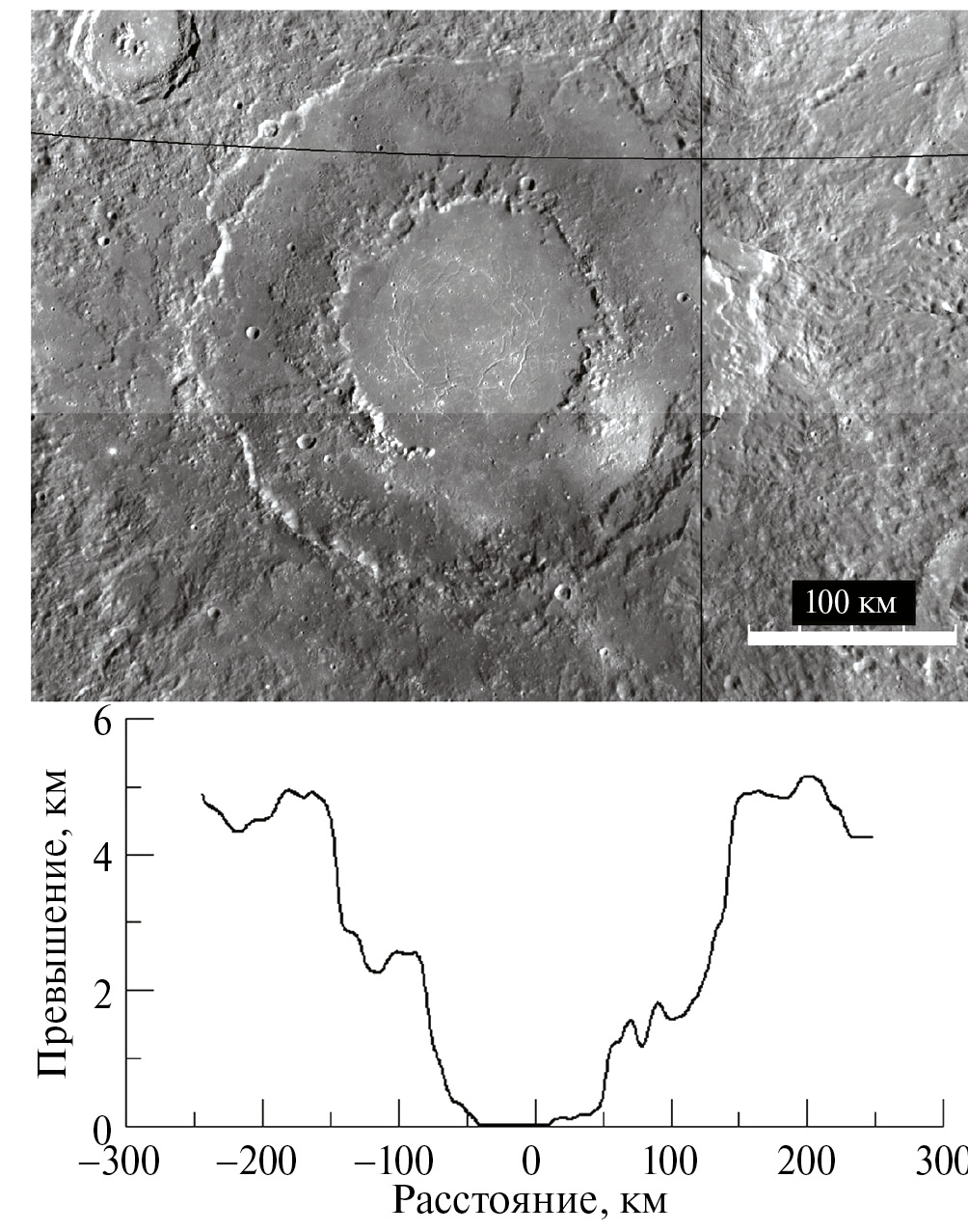 Рис. 2. Ударный кратер Рахманинов (D ~ 300 км) на Меркурии (вверху) и высотный профиль поверхности вдоль диаметра кратера (внизу). Внутренний кратер имеет глубину около 4.5 км. Изображение и профили высот построены автором с помощью общедоступного программного обеспечения JMars (https://jmars.asu.edu) по результатам полета к Меркурию КА Messenger (https://www.nasa.gov/mission_pages/messenger/main/index.html).