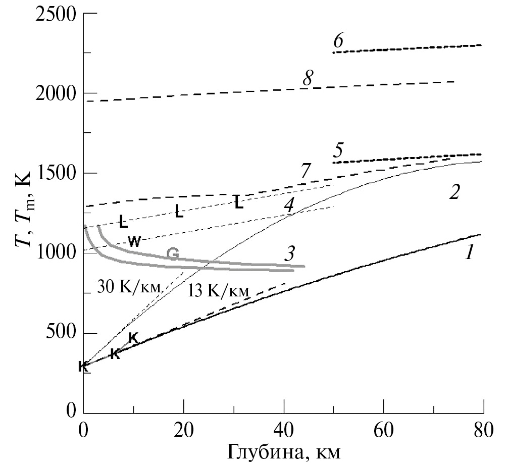 Furlong и Chapman (2013) рассматривают основные подходы к построению вертикальной минеральной и тепловой структуры земной коры. Температура на границе Мохо изменяется в зависимости от величины теплового потока, а кажущееся отсутствие расплавленной нижней коры требует изменения минерального состава породы с глубиной, поэтому наша простая “гранитная” кора не работает с типичной Tm(p) для “мокрого гранита” (Furlong, Chapman, 2013). Для районов с толстой корой (до 55 км, например, в Финляндии) геолого-геофизический анализ указывает на относительно холодную астеносферу с T ~ 700 K на глубине z ~ 55 км и T ~ 1400 K на глубине z~180 км (Kukkonen, 1998). Региональная вариация минеральной и тепловой структуры коры может иметь существенное значение (см, например, Schutt и др., 2018; Puziewicz и др., 2019) и будущие модели должны быть переформулированы с использованием более свежих геофизических данных (Cammarano, Guerri, 2017; Artemieva, Shulgin, 2019).