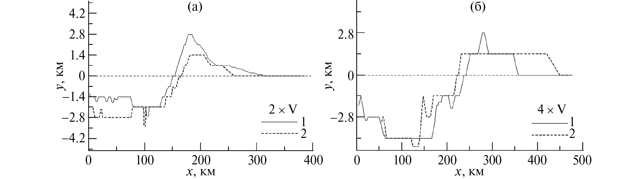 Рис. 10. Профили модельных кратеров для вариантов 2 × V (а) и 4 × V (б) с большим увеличением по вертикали, чтобы показать относительно малую глубину (~1.5 и ~3 км соответственно) финальных кратеров с видимыми диаметрами ~300 и ~500 км. Малые деления на вертикальной оси соответствуют размерам расчетных ячеек ∆x = 0.7 км (вариант 2 × V) и ∆x = 1.4 км (вариант 4 × V). Профили на панелях (а) и (б) соответствуют расчетам с использованием модели акустической флюидизации в мантии (1) и без ее использования (2).