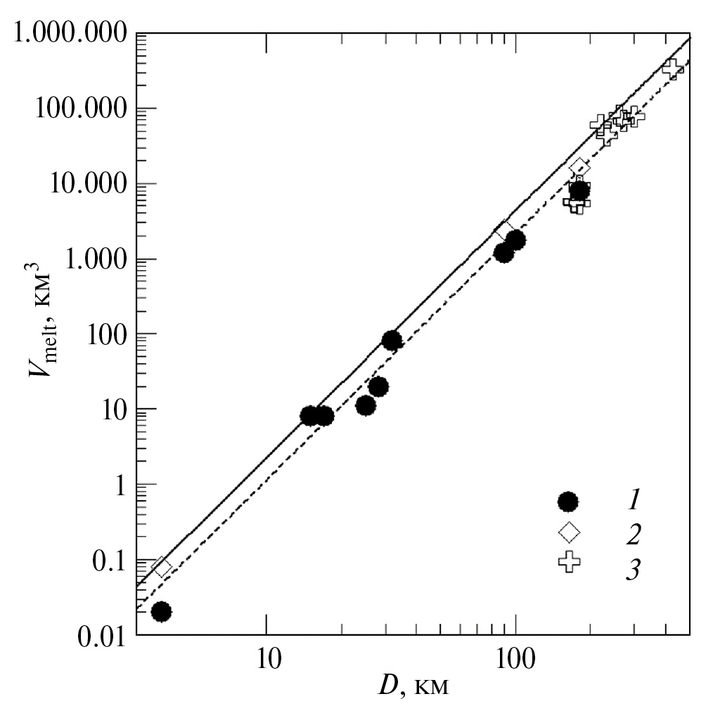 Рис. 11. Оценка объемов ударного расплава в известных земных метеоритных кратерах из работы (Cintala, Grieve, 1998): 1 – наблюдения, 2 – максимальные оценки, 3 – модельные результаты настоящей работы. Сплошная и пунктирная линии трендов описаны в тексте.