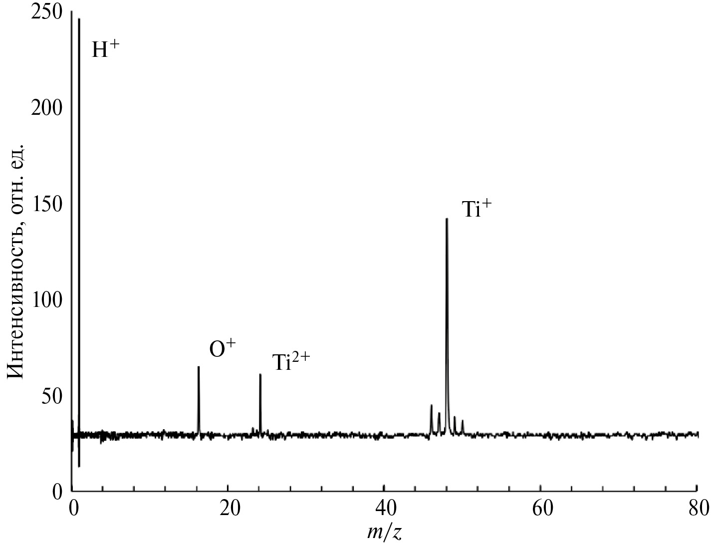 Рис. 4. Спектр водяного льда с примесью 1% TiH2, полученный с помощью прибора в летной конфигурации. В спектре присутствуют массовые пики изотопов титана.