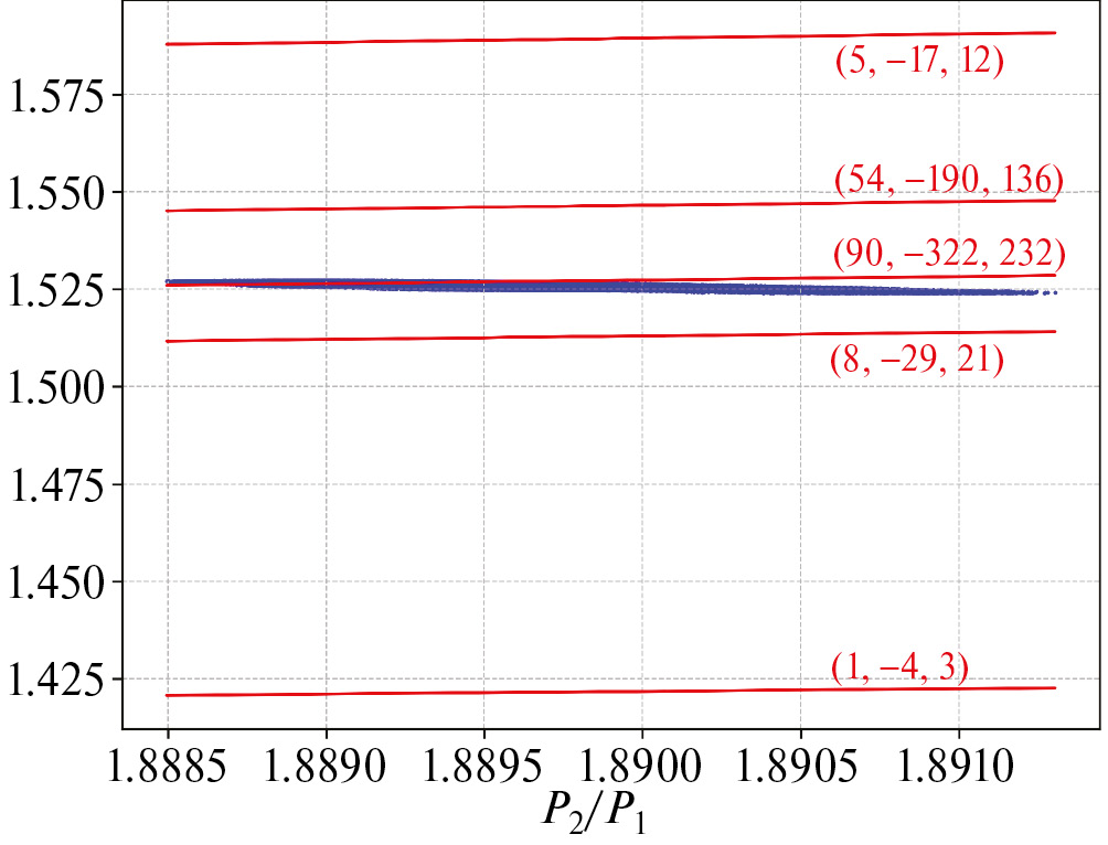 Рис. 4. Эволюция системы Kepler-51 в области трехтельных резонансов – цепочек двухтельных резонансов средних движений. Красные линии соответствуют положению трехтельных резонансов. Система эволюционирует слева направо.