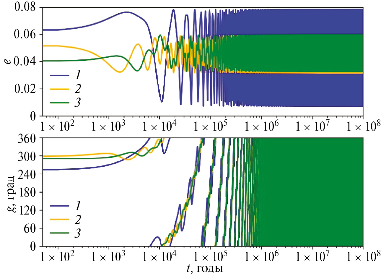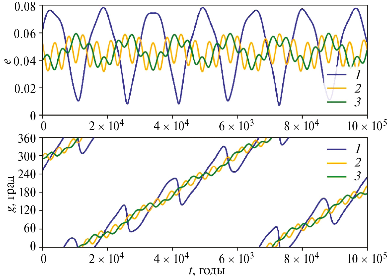 На рис. 5 представлены графики средних эксцентриситетов e и аргументов перицентров g орбит планет системы Kepler-51 на интервале времени 100 млн лет для номинальных начальных значений e и g. На рис. 6 представлены те же графики, но на интервале времени 100 тыс. лет. Наклоны орбит и долготы восходящих узлов сохраняют свои нулевые значения. Эксцентриситет орбиты внутренней планеты e1 изменяется в интервале от 0.00725 до 0.07840 с периодом 15506 лет (Kepler-51 b), эксцентриситет e2 изменяется в интервале от 0.03165 до 0.05912 с периодом 4326 лет (Kepler-51 c), эксцентриситет e3 – от 0.03275 до 0.05961 с тем же периодом 4326 лет (Kepler-51 d). Эксцентриситеты e2 и e3 орбит двух внешних планет Kepler-51 c и Kepler-51 d изменяются в противофазе.