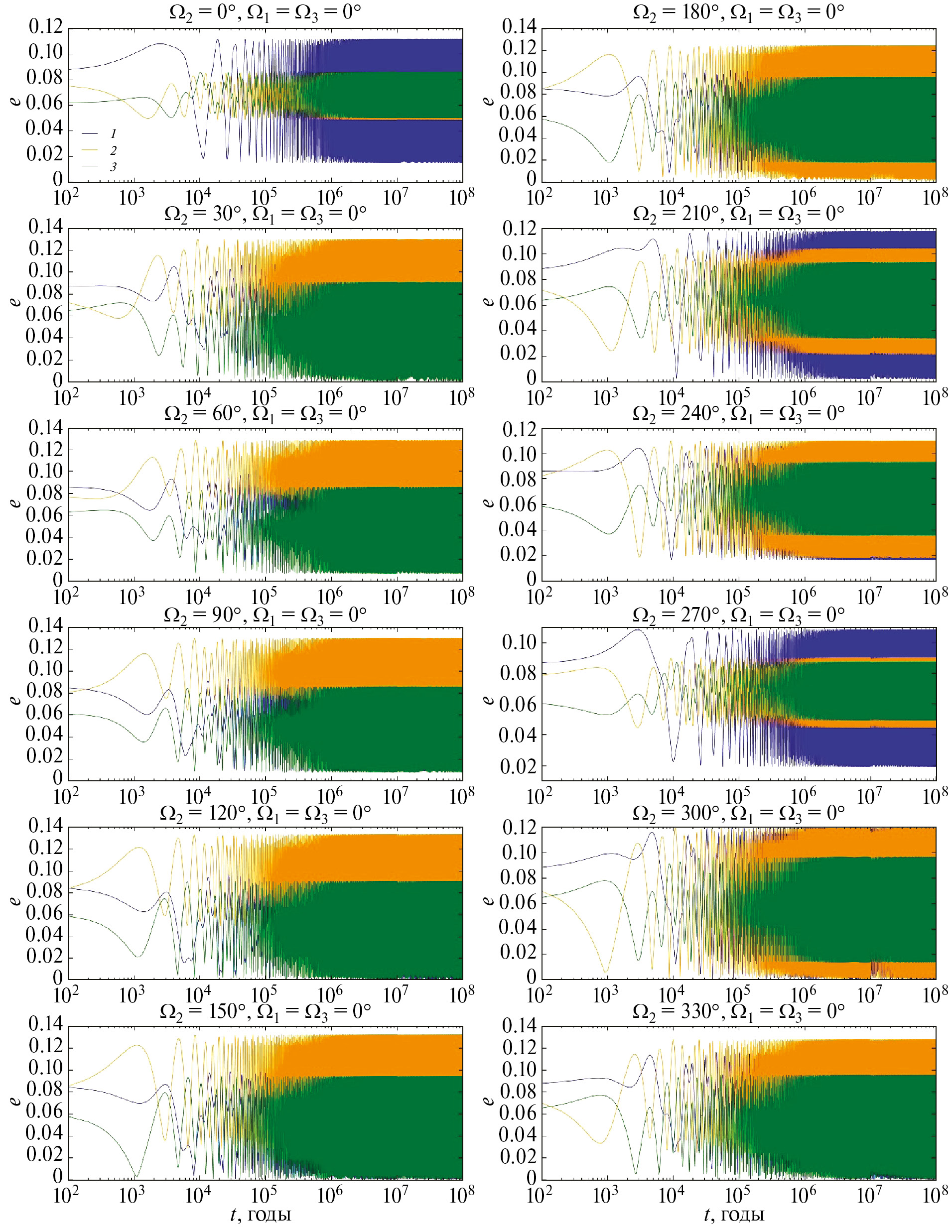 Рис. 9. Эволюция средних эксцентриситетов орбит планет (1 – Kepler-51 b, 2 – Kepler-51 c, 3 – Kepler-51 d) на интервале 100 млн лет для соответствующих им начальных значений оскулирующих элементов орбит: I2 = 0.6°, I1 =I3 = 0°, Ω1 = Ω3 = 0°, аргументы перицентров – номинальные, эксцентриситеты орбит – максимальные, Ω2 – варьируется с шагом 30°.