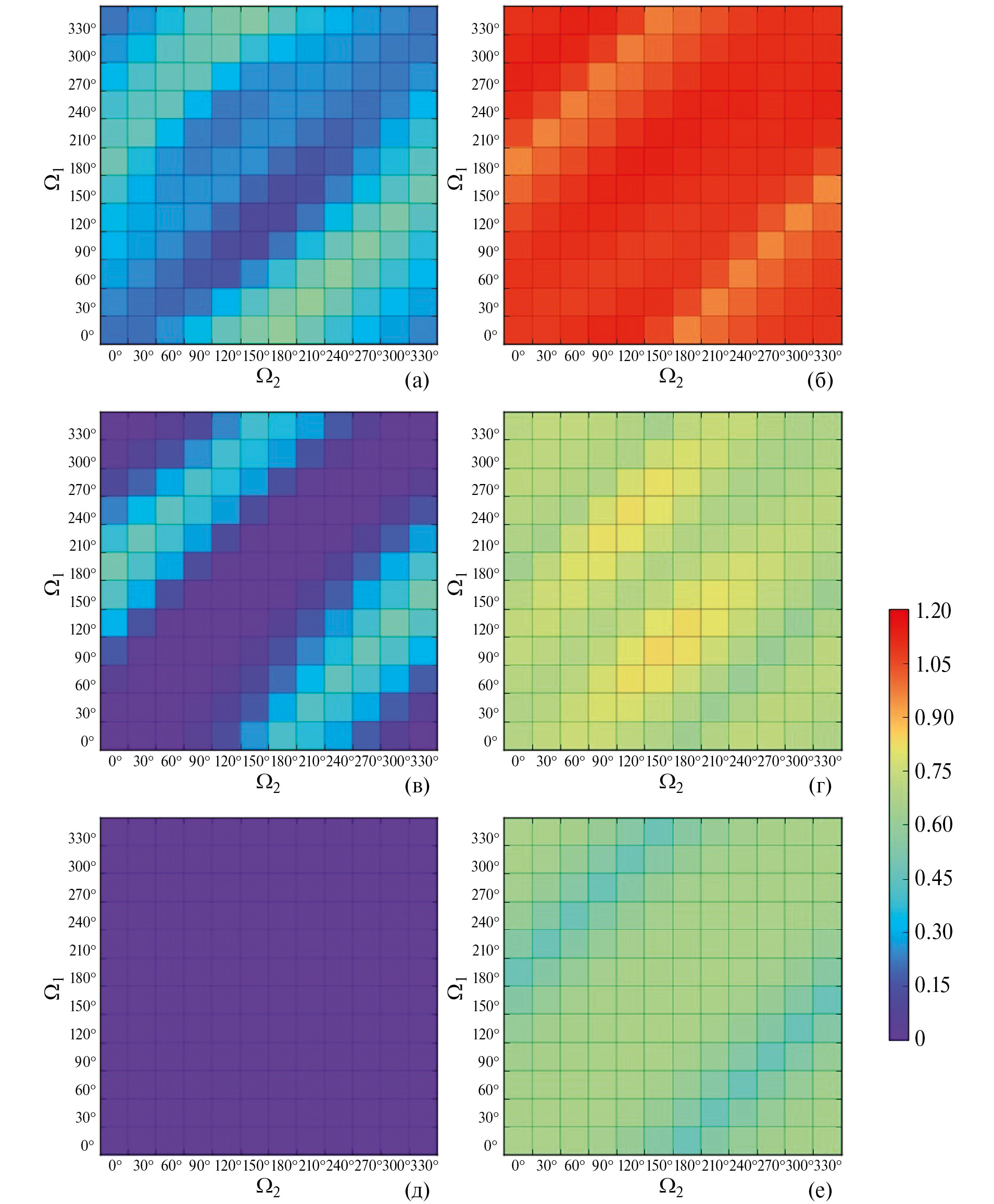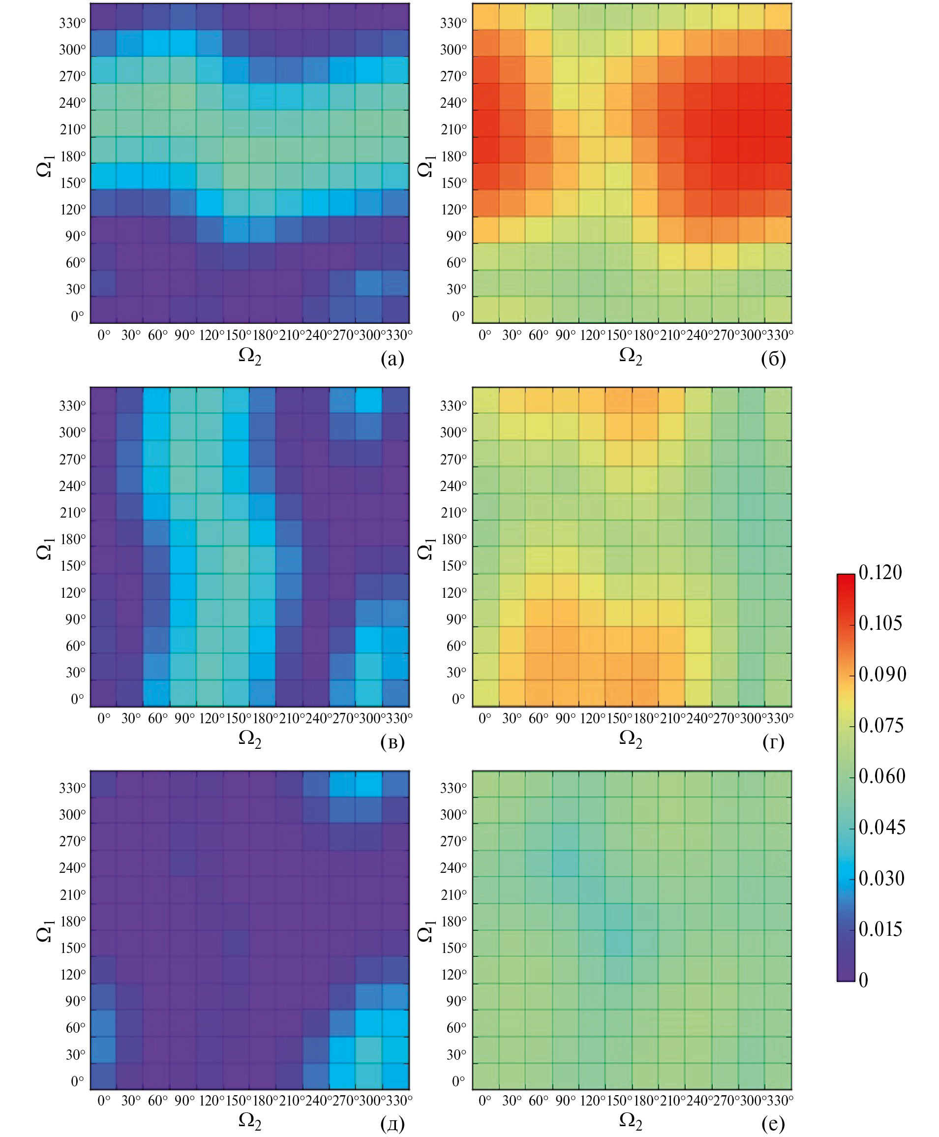 Рис. 12. Карты минимальных (левый столбец) и максимальных (правый столбец) значений наклонов орбит планет на интервале времени 100 млн лет (НУ: эксцентриситеты орбит – номинальные, I1 = 0.9°, I2 = 0.6°, I3 = 0°, g1 = 252.1, g2 = 322.9°, g3 = 263.5°): (а) – минимально достижимые значения наклона орбиты планеты Kepler-51 b; (б) – максимально достижимые значения наклона орбиты планеты Kepler-51 b; (в) – минимально достижимые значения наклона орбиты планеты Kepler-51 c; (г) – максимально достижимые значения наклона орбиты планеты Kepler-51 c; (д) – минимально достижимые значения наклона орбиты планеты Kepler-51 d; (е) – максимально достижимые значения наклона орбиты планеты Kepler-51 d.