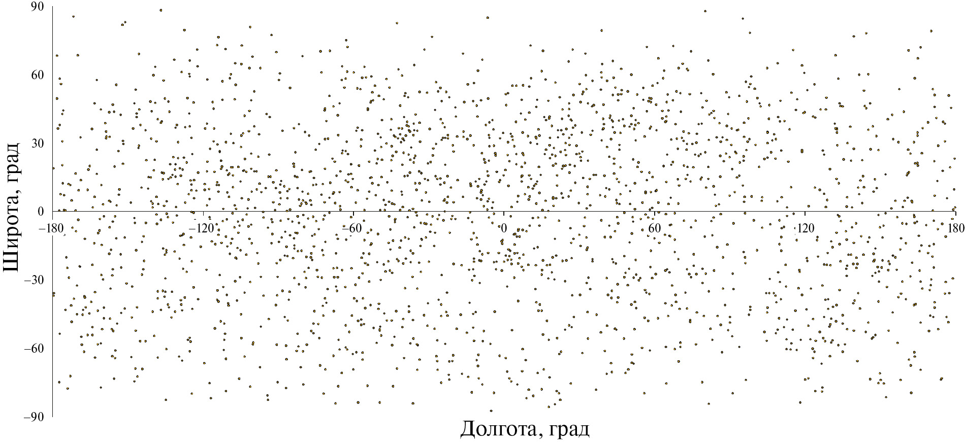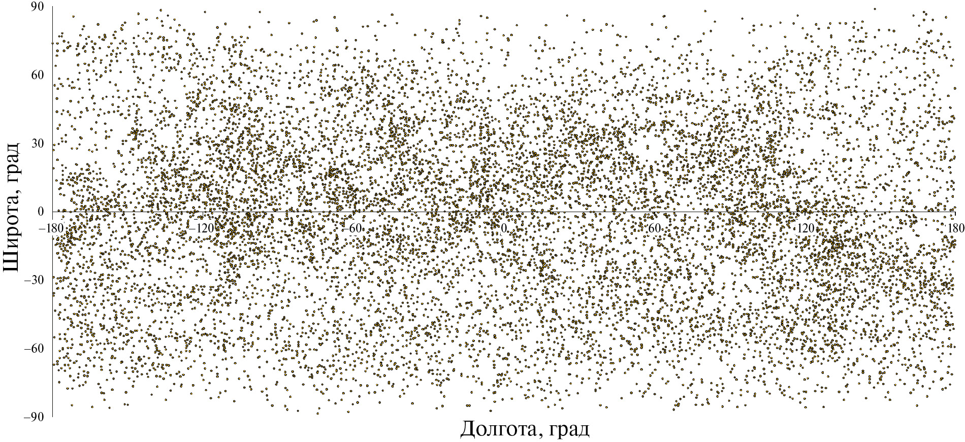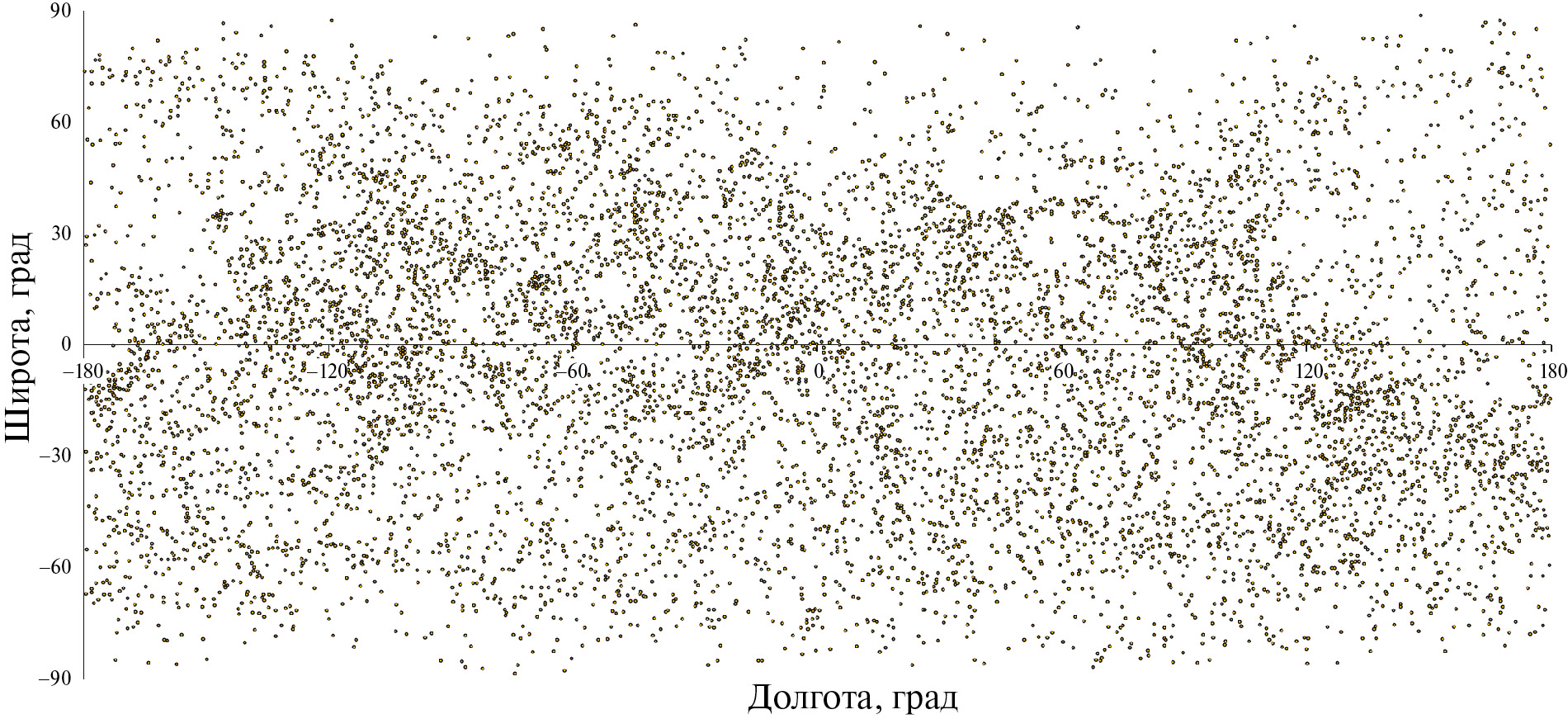 Рис. 1. Распределение кратеров с D ≥ 10 км, входящих в новый Морфологический каталог по поверхности Меркурия. Средняя плотность кратеров с диаметрами ≥10 км на поверхности Меркурия 165 кратеров на 1 млн км2.