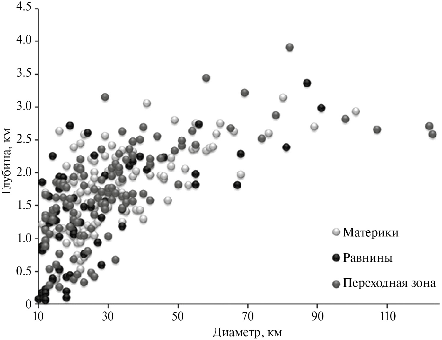 Распределение кратеров по глубине в зависимости от типа подстилающей поверхности показано на рис. 8. Чтобы исключить влияние слоя лавы на конечную глубину кратера, мы рассматривали только те кратеры, которые не имеют лавы на дне. Мы учитывали только хорошо сохранившиеся кратеры (1-го класса сохранности по классификации данного каталога). Всего было исследовано 290 кратеров: 66 кратеров на равнинах, 112 кратеров на материках и 112 в переходной зоне. Диаметр большинства рассмотренных кратеров не превышает 40 км. Значения глубин для трех видов подстилающей поверхности лежат в пределах 0.07 до 3.9 км. Наибольшая глубина кратеров, расположенных в переходной зоне, достигает 3.9 км, наибольшая глубина кратеров, расположенных на материках – 2.7 км, на равнинах – 3 км (рис. 8). Отношение глубины кратера (h) к диаметру (D) для равнин находится в пределах 0.006–0.53, для материков h/D = 0.025–0.17, для переходной зоны h/D = 0.015–0.13. Таким образом, наибольшее значение величины h/D наблюдается у кратеров, расположенных на равнинах. Этот вывод не согласуется с заключением, сделанным в работе (Kalynn и др., 2013), что различия в глубине между кратерами, расположенными на различных типах подстилающей поверхности, обусловлены пористостью вещества поверхности. Согласно (Kalynn и др., 2013), кратеры, расположенные на лунных материках, глубже, чем кратеры, расположенные на морях. В работе (Fassett и др., 2017) был получен аналогичный вывод для кратеров Меркурия диаметром 2.5–5 км: кратеры, расположенные на равнинах Меркурия, оказались менее глубокими, чем кратеры на материках.