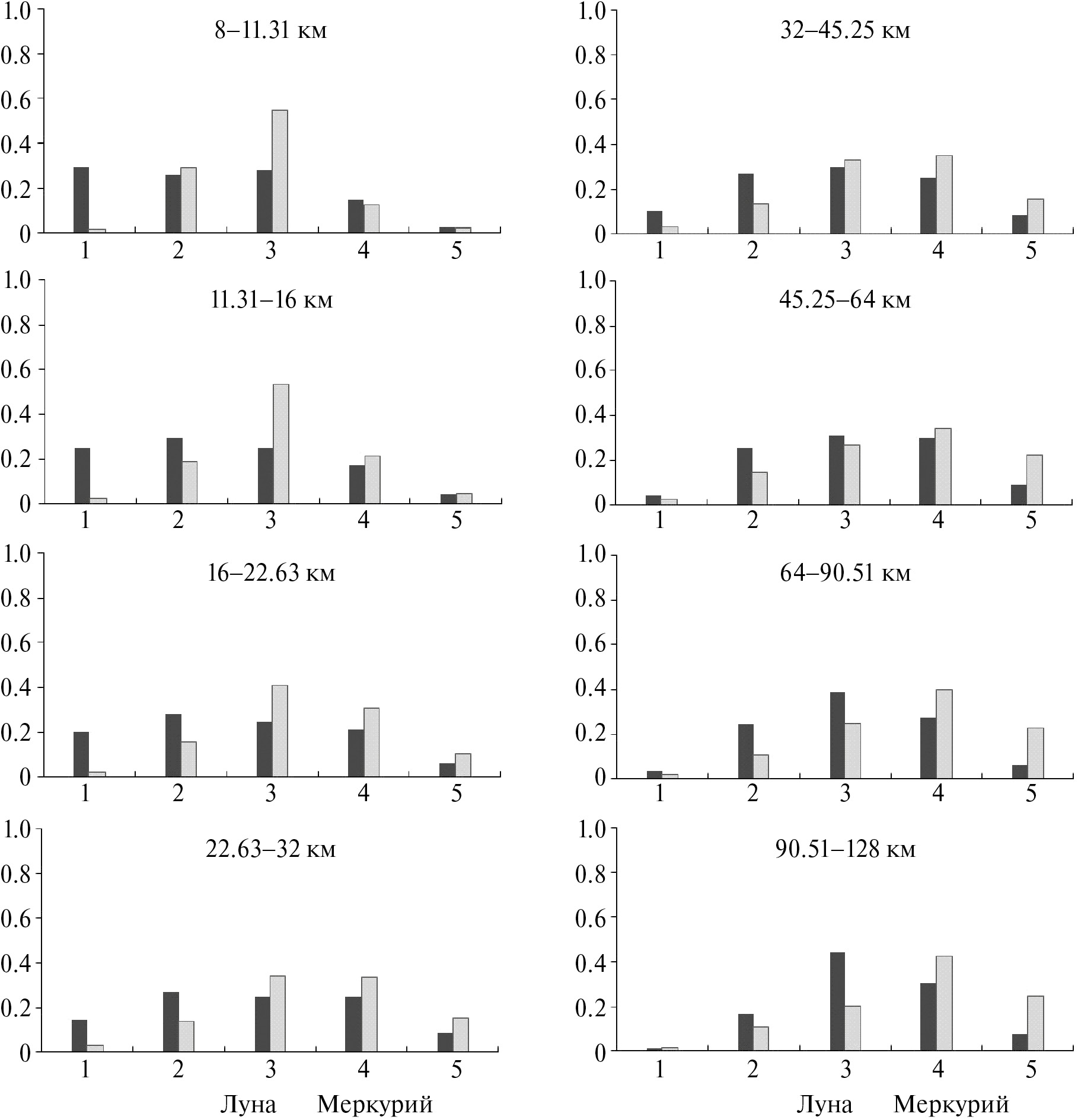 Рис. 10. Распределение кратеров Меркурия и Луны по наличию террас и обрушений на склонах. По горизонтальной оси отложены номера подпризнаков в соответствии с табл. 1. Число кратеров в заданном интервале диаметров принимается за 1.
