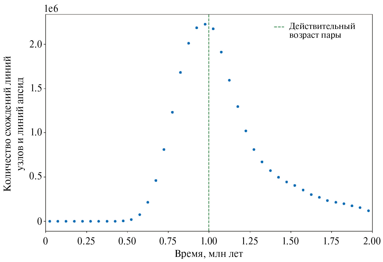 Вариант № 1 – пара № 1, номинальный возраст 1 млн лет, высокая точность определения орбиты. Для моделирования было создано 1000 клонов для каждого ТНО пары. Проверка условий формирования пары (1) и поиск минимума метрики ρ2 выполнялись для каждой пары “клон первого компонента – клон второго компонента” (1000 × 1000 = 1 млн пар). На рис. 1 показано распределение количества схождений линий узлов и линий апсид, а на рис. 2 дано распределение количество минимумов метрики Холшевникова ρ2 по времени. На рис. 1 и 2 штриховой линией отмечен номинальный возраст пары 1 млн лет. Для оценки возраста пары мы использовали медианное и среднее значения распределений, а для оценки ошибки – интервал от 5-го до 95-го перцентиля и среднеквадратичное отклонение.