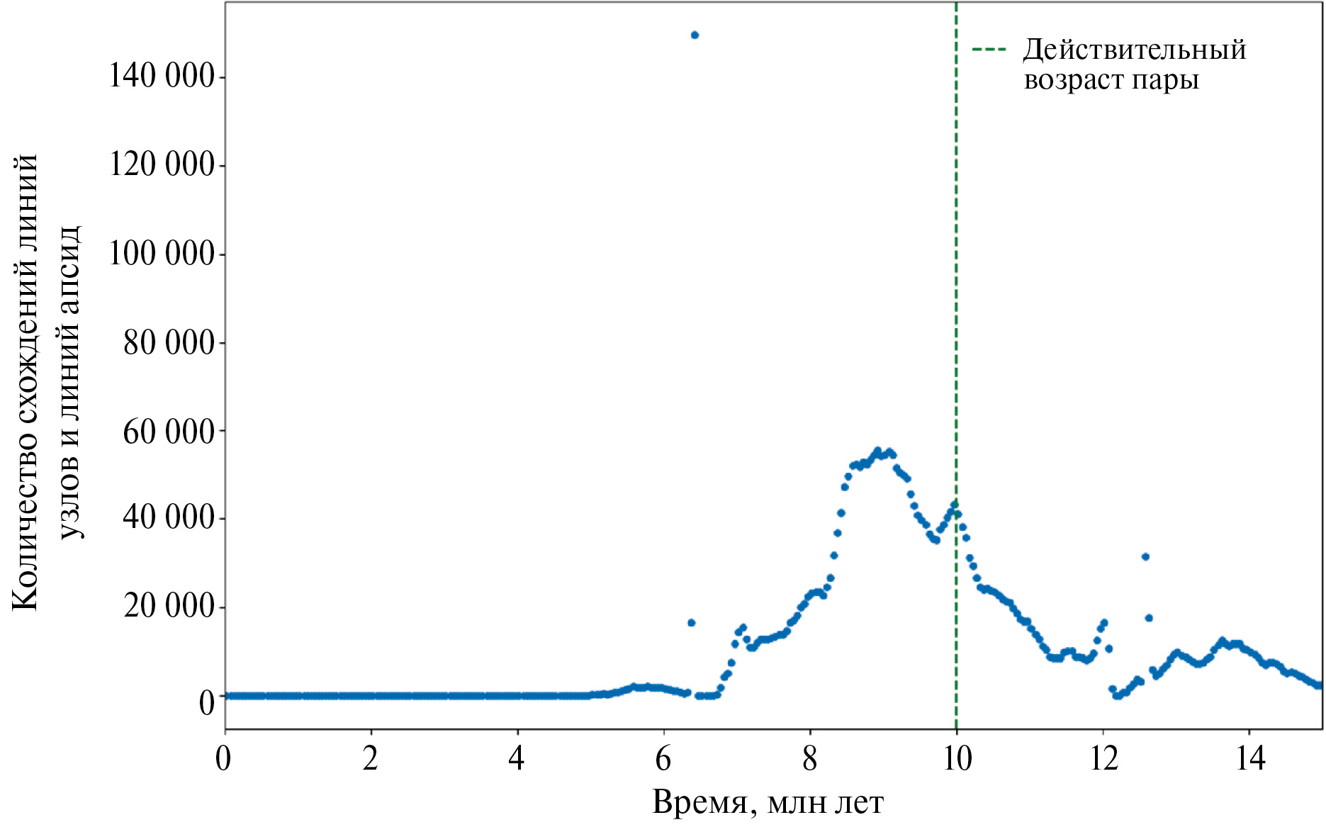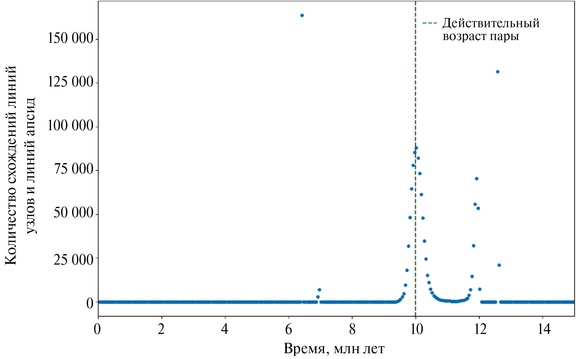 Рис. 3. Оценка возраста пары № 1 (номинальный возраст 10 млн лет, высокая точность определения орбиты). Метод оценки – анализ схождений линий узлов и линий апсид.