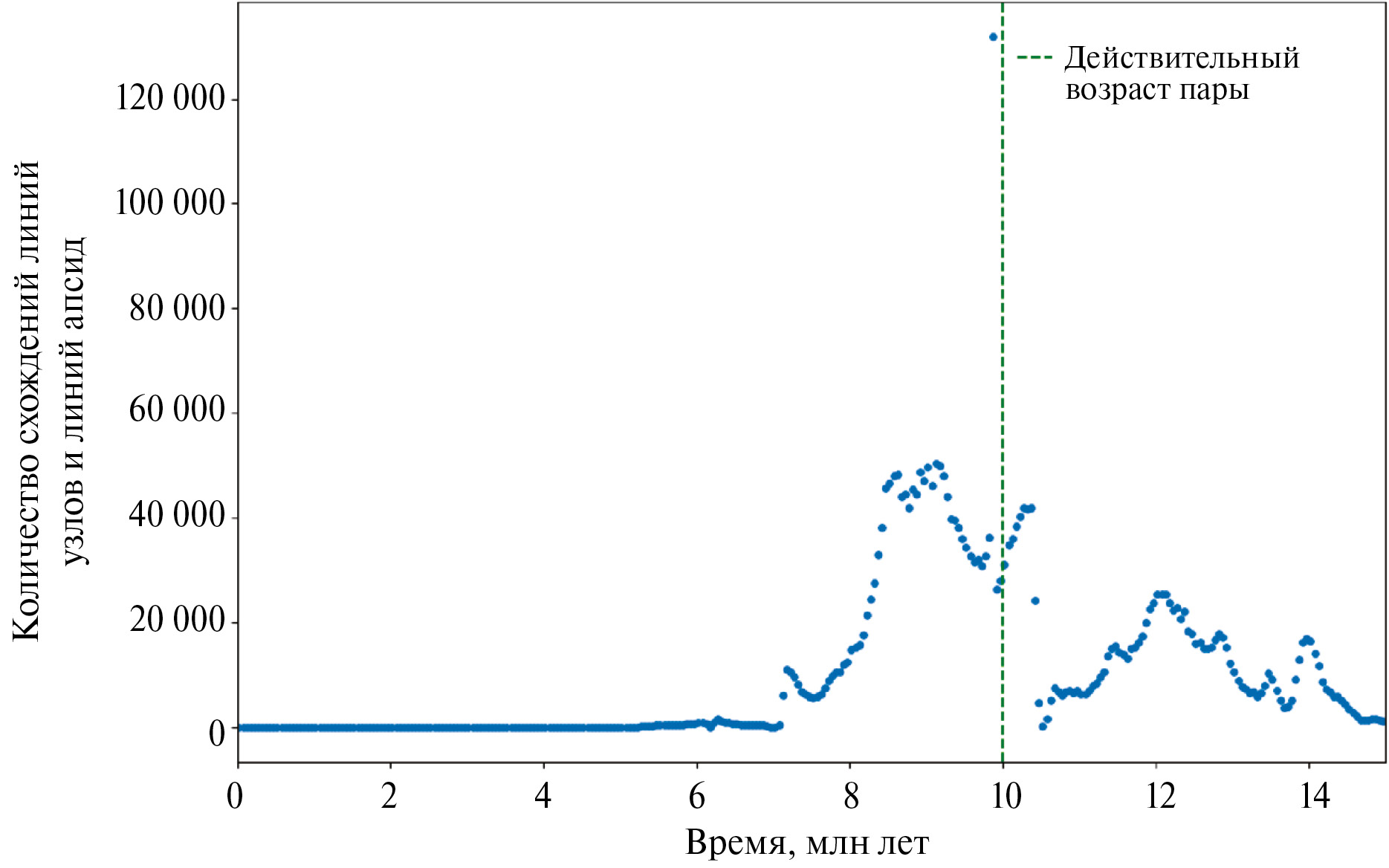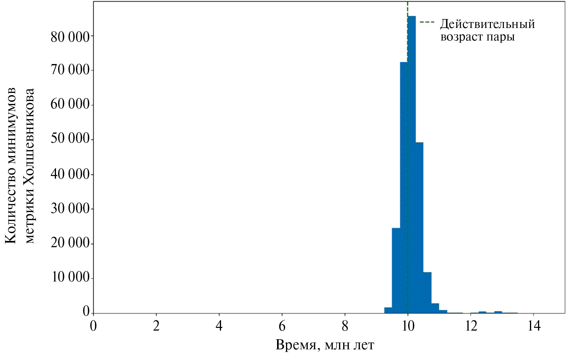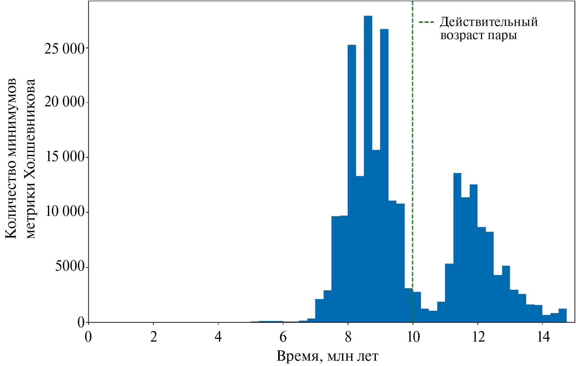 Вариант № 4 – пара № 1, номинальный возраст 10 млн лет, сверхвысокая точность определения орбиты. Ширина распределения оценки возрастов при сверхвысокой точности орбиты заметно меньше, чем при высокой точности (см. рис. 7 и рис. 8). Для около 249 тыс. пар клонов выполнен критерий формирования (1). На рис. 7 выделяются ложноположительные результаты проверки условия формирования пары (1) вблизи моментов 7 и 12 млн лет. Распределение оценки возрастов методом анализа минимумов метрики Холшевникова имеет всего один доминирующий максимум вблизи момента формирования. Оценим возраст пары методом анализа схождений линий узлов и линий апсид только вблизи окрестности этого максимума. Результаты оценки приведены в табл. 8. Ошибка медианной оценки возраста методом анализа схождений линий узлов и линий апсид с учетом ложноположительных результатов составляет от 3.7 до 2.5 млн лет, а среднеквадратичное отклонение для среднего значения – 1.7 млн лет.
