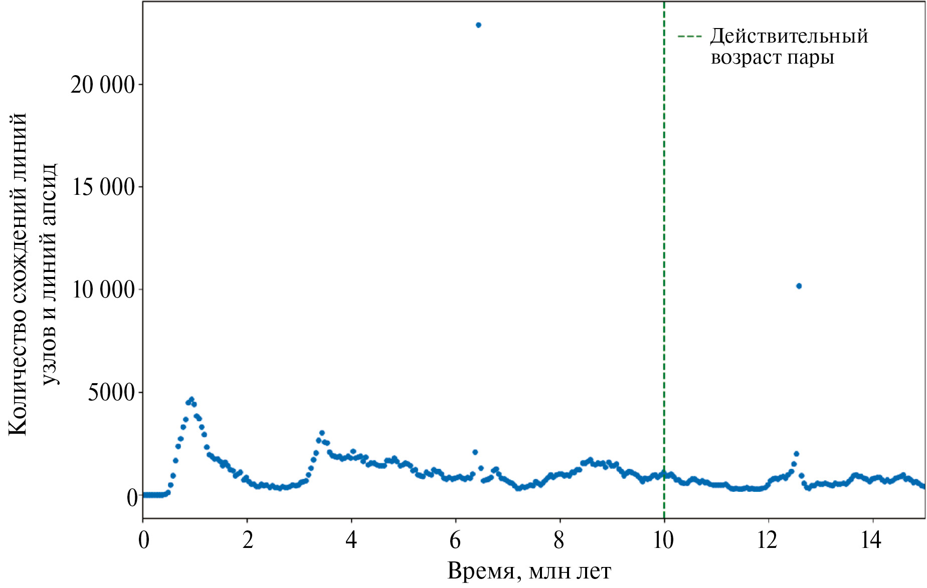 Рис. 9. Оценка возраста пары № 1 (номинальный возраст 10 млн лет, низкая точность определения орбиты). Метод оценки – анализ схождений линий узлов и линий апсид.