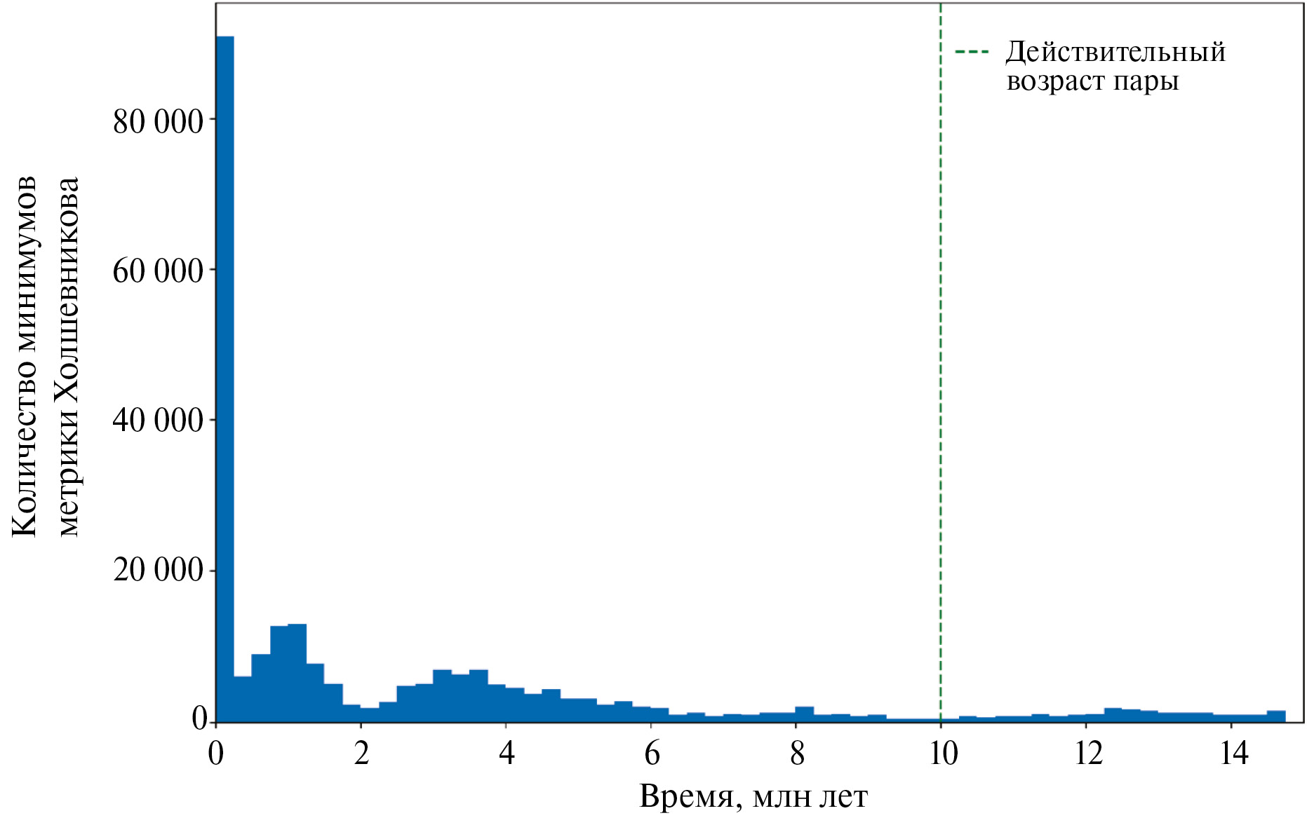На рис. 3 показано распределение количества схождений линий узлов и линий апсид, а на рис. 4 дано распределение количество минимумов метрики Холшевникова ρ2 по времени. В табл. 6 приведены оценки возраста пары. Для около 207 тыс. пар клонов выполнялся критерий формирования (1). Ошибка определения возраста на основе медианной оценки для рассматриваемых методов составляет от 2.9 до 4.5 млн лет, а по среднеквадратичной ошибке среднего – 1.9 и 2.4 млн лет. С учетом ошибок оцениваемых величин возраст пар обоими методами определен корректно.