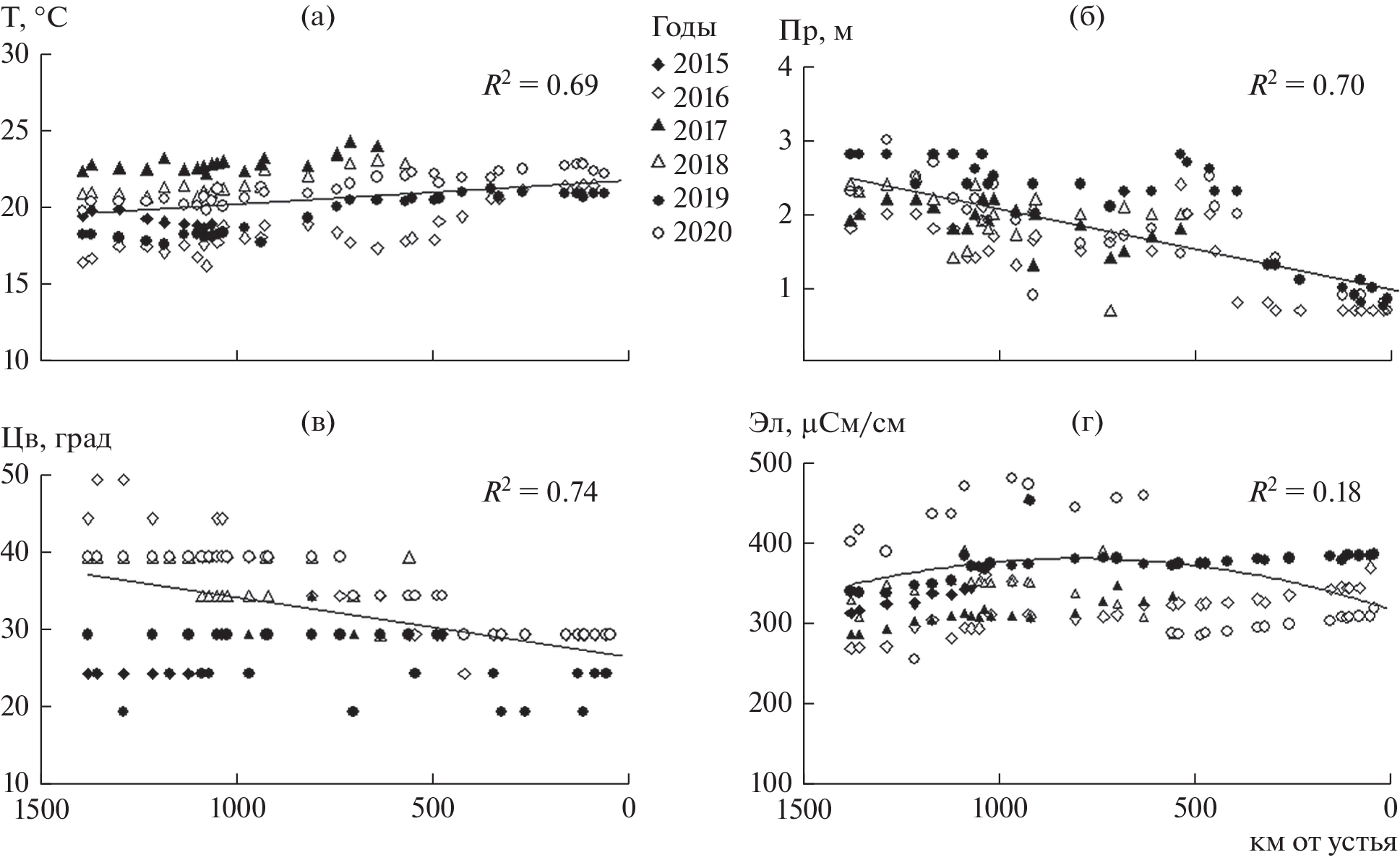 Based on field observations carried out during the 2015–2020 summer low water period, the interannual variability of abiotic characteristics and chlorophyll content in the Lower Volga is considered. In years with different thermal conditions and water content, the temperature, transparency, color and electrical conductivity of water are characterized by small variability and demonstrate changes from north to south, according to the zonal features of the Volga cascade. The average nutrient content (0.81–0.99 mg/L Ntot and 101–134 μg/L Ptot) changes insignificantly in the Saratov and Volgograd reservoirs, but decreases in the unregulated lower part of the Volga. The content of N-N\({\text{O}}_{3}^{ - }\) and P-P\({\text{O}}_{4}^{{3 - }}\) in the total nitrogen and phosphorus pool respectively, is 4–9 and 69–74%, the ratio Ntot/Ptot < 10 indicates a possible nitrogen limitation of phytoplankton. The Chl a content corresponds to the mesotrophic category in the Saratov and Volgograd reservoirs (5.3 ± 0.6 and 7.2 ± 0.9 μg/L), and eutrophic in the lower section (13.9 ± 1.5 μg/L). The trophic status of the Lower Volga has not changed in comparison with the last decade of the 20th century. It was found that abiotic factors have a weak effect on the Chl a content in the Saratov reservoir, moderate in the Volgograd reservoir and almost completely control the development of phytoplankton in the unregulated lower part of the Volga (R2 = 0.21, 0.59, and 0.91). The data obtained supplement the observations of previous years and form the basis for long-term monitoring of ecosystems of large artificial reservoirs.