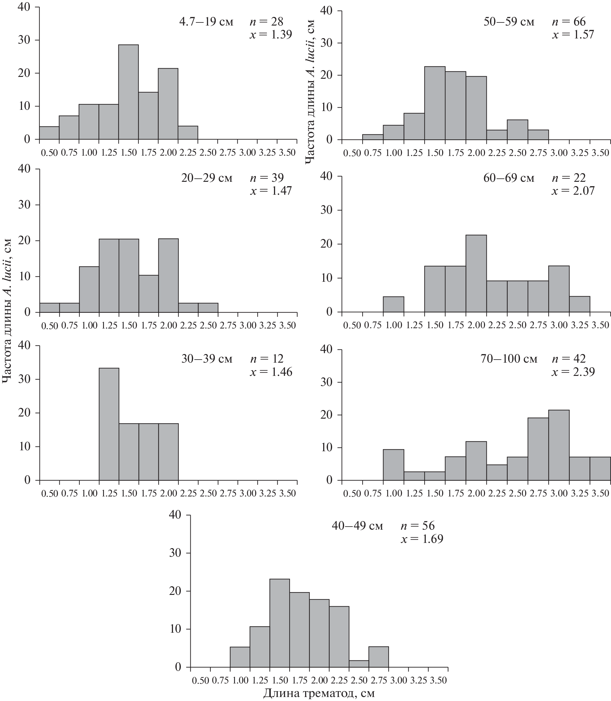 The ratio of the body length of the trematodes Azygia lucii and the body length of pikes in the population of the Rybinsk Reservoir was studied. The material was collected in September–October from 2018 to 2021. A total 386 pike was divided into seven size classes according to body length (range 4.7–83 cm). The prevalence of A. lucii increased from 14.2% in underyearlings to 46.2% in pikes 9+. The distribution of the trematodes in all size classes was aggregated. The usual intensity of invasion was 1–3 trematodes in all classes; the proportion of fish with this intensity of invasion varied from 62.5 to 83.3%. A total of 259 worms were measured. The body length of the found worms ranged from 0.49 to 3.5 cm. The average length of A. lucii increased with host size from 1.39 cm in underyearlings to 2.39 cm in older pikes. The largest trematodes (3–3.5 cm long) were found in the largest pikes. Distribution/redistribution of trematodes in the pike population occurs due to pike cannibalism. Due to this, a group of trematodes is formed in large pikes, consisting of worms of different ages and sizes. An important role in the formation of such groups of trematodes is played by paratenic hosts. Their significance depends on their infection rate and the proportion in diet of pike in a particular reservoir. Features of the biology of A. lucii (large body size, short contact of trematodes with mollusks) suggest a long lifespan of marites.