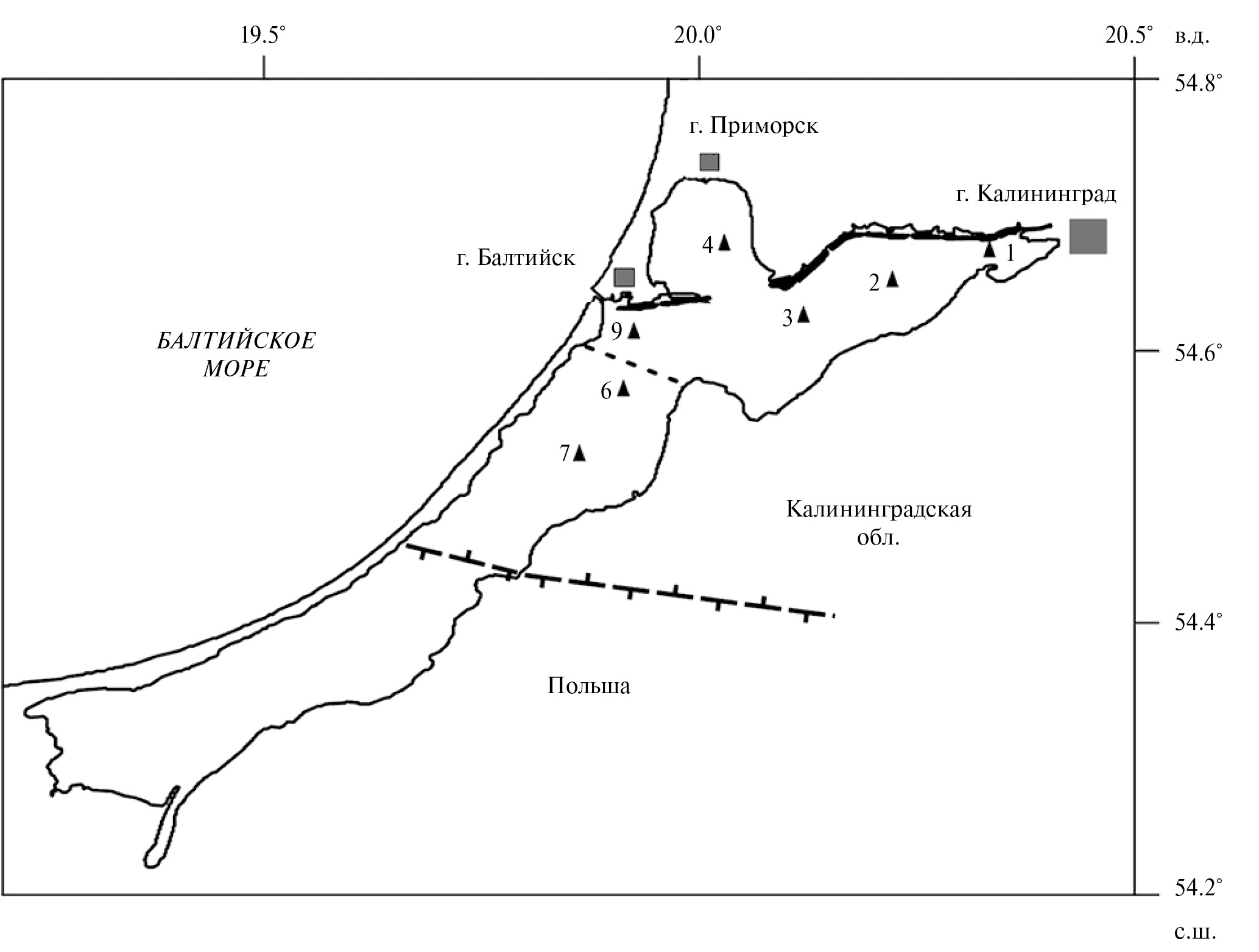 Вислинский залив — одна из крупнейших лагун Европы (площадь 838 км2, объем 2.3 км3), представляет собой достаточно обособленный водоем, отделенный от Балтийского моря песчаной косой с узким проливом (рис. 1). Водоем находится под сильным воздействием природных условий (водообмен с морем, речной сток, климатические изменения), биологической инвазии и антропогенного воздействия. Гидрологический, гидрохимический режимы и структура биоценозов солоновато-водного Вислинского залива, во многом, определяются взаимодействием морских и речных вод (17.0 и 3.6 км3/год соответственно) (Chubarenko, Margoński, 2008).