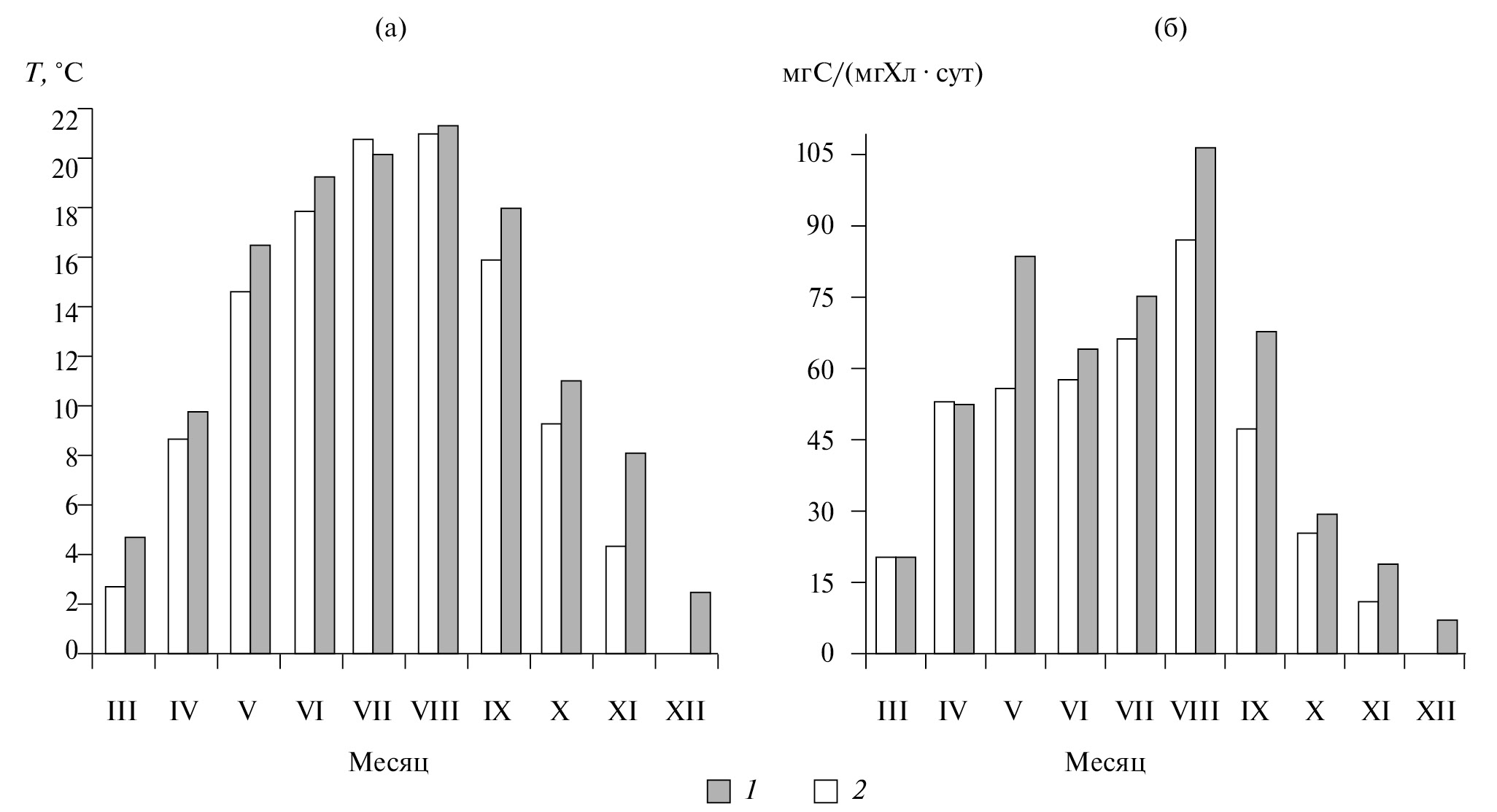 Рис. 2. Динамика температуры воды (а) и суточного ассимиляционного числа (б) в 2001–2010 гг. (1) и 2011–2020 гг. (2).
