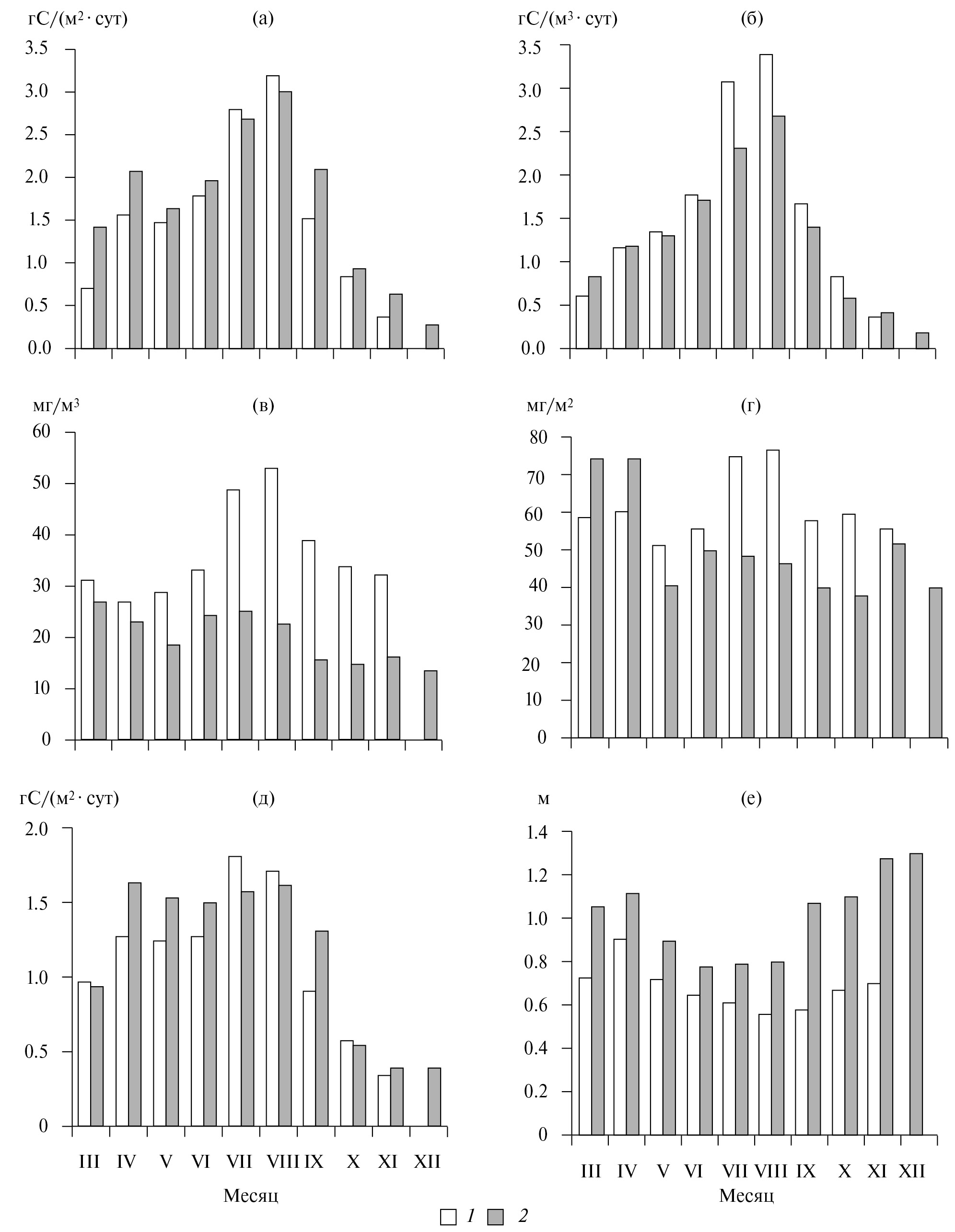 Рис. 3. Показатели продуктивности фитопланктона в 2001–2010 гг. (1) и 2011–2020 гг. (2): а — первичная продукция; б — максимальная скорость фотосинтеза; в, г — концентрация Хл в фотическом слое (в м3 и под м2, соответственно); д — деструкция органического вещества, е — прозрачность воды.