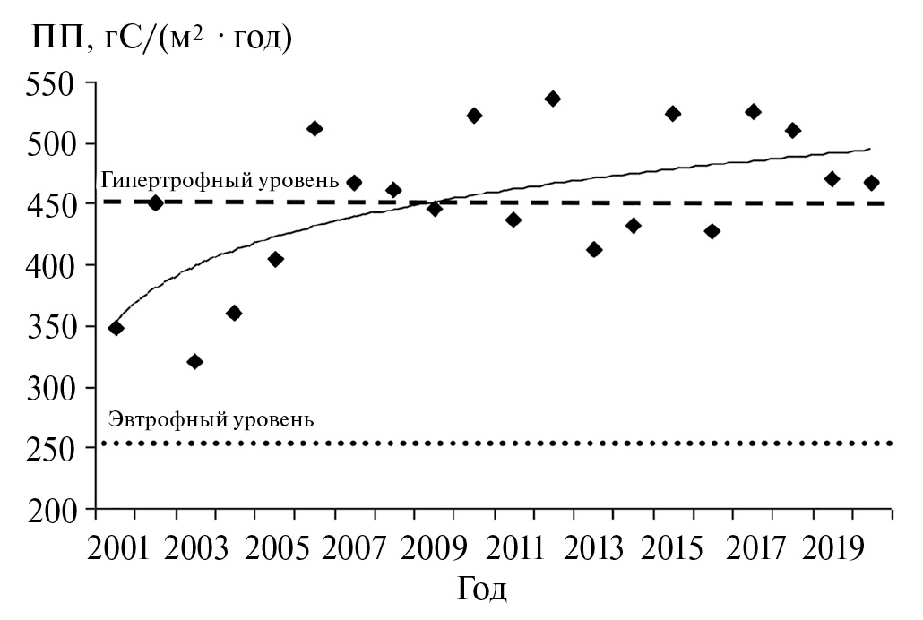 ПП как комплексный показатель гидрохимических и гидробиологических процессов может быть одним из основных критериев оценки эффективности очистки бытовых и промышленных стоков, поступающих в водоемы (Кожова, 1993). Ожидавшийся с 1990‑х гг. ввод в г. Калининград в 2016 г. современных очистных сооружений с целью снижения загрязнения и эвтрофирования вод не оказал значимого влияния на снижение ПП в заливе в 2016–2020 гг. Несмотря на уменьшение локального загрязнения в отдельных районах, концентрации биогенных элементов в воде, влияющие на ПП, остались на высоком уровне из-за их многолетней аккумуляции, в том числе в донных осадках (Александров, Сташко, 2021). Необходимы более длительные наблюдения для оценки природоохранных мероприятий в масштабе всей крупной лагунной экосистемы.