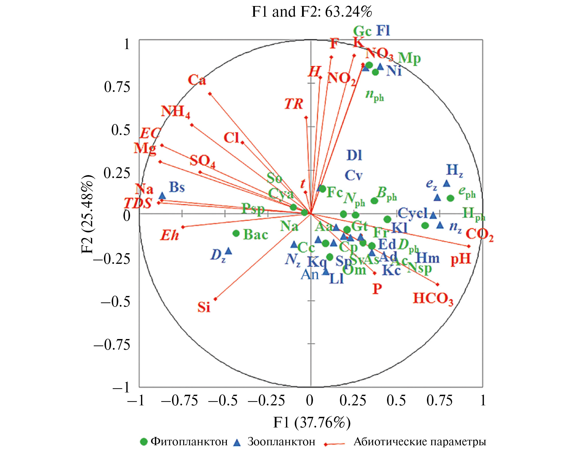 Влияние факторов среды. Анализ главных компонент (PCA) выявил корреляцию между показателями разнообразия и структуры фито- и зоопланктона и численности массовых видов в разных по экологическим условиям водоемах. Выделено две главные компоненты, определяющие 63.24% вариаций набора данных с собственными значениями >1. Первый фактор (F1: 37.76%) определял гидрохимические показатели. Факторные нагрузки переменных (pH, CO2, HCO3-) демонстрировали положительную корреляцию с индексами разнообразия фито- и зоопланктона, переменные (Eh, Mg2+, Na+, TDS) определяли численность коловраток Brachionus sericus. Второй фактор (F2: 25.84%) интегрирует информацию о положительной связи физико-химических параметров (Н, Cl-, F-, K+, NO3–, NO2–) с числом видов альгофлоры, численностью некоторых водорослей (Gloeocapsa сrepidinum, Microcystis pulverea) и беспозвоночных (Filinia longiseta и Neutrodiaptomus incongruens). Анализ данных показал положительную корреляцию доминирующих видов диатомовых с Si, сине-зеленых — с T, большинства гидробионтов — с P (рис. 3).