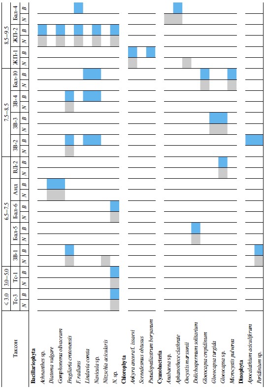 Таблица 2. Видовой состав доминантов фитопланктона по численности N и биомассе B в техногенных водоемах в градиенте рН (≤3.0–9.5)