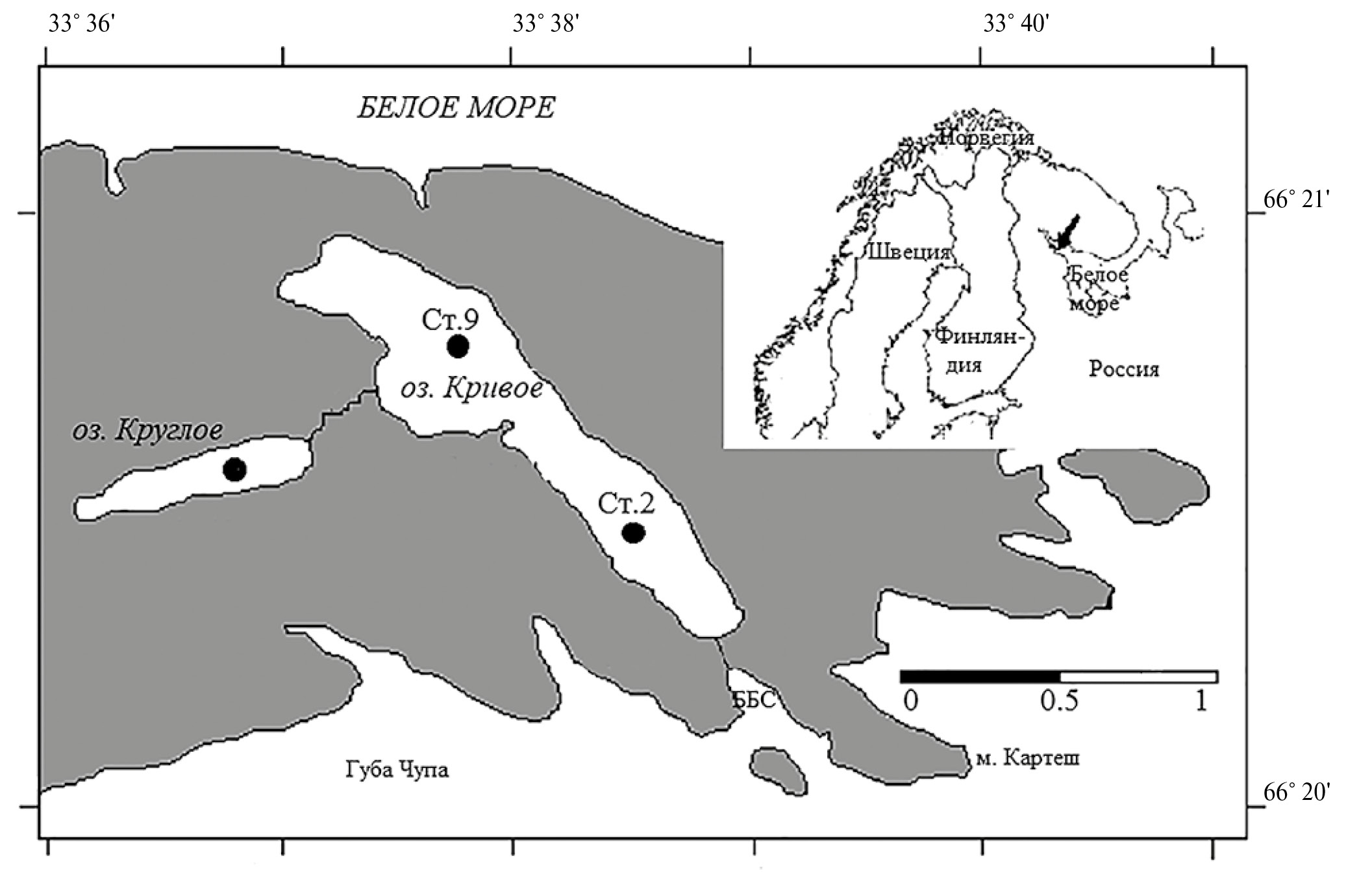 Изученные озера. Малые озера: глубокое Кривое (66.3435° с.ш., 33.6375° в.д.) и мелкое Круглое (66.3429° с.ш., 33.6119° в.д.) расположены в северной Карелии (Россия) вблизи побережья Кандалакшского залива Белого моря в 30 км к югу от Полярного круга (рис. 1). Глубокое оз. Кривое находится на высоте ~7 м над уровнем моря. В юго-западной части оно через эфемерный ручей соединяется с мелководным оз. Круглое (рис. 1). Оба озера олиготрофные, но мелководное оз. Круглое имеет признаки дистрофии и характеризуется гумифицированной водой (Терентьев, Березина, 2022).