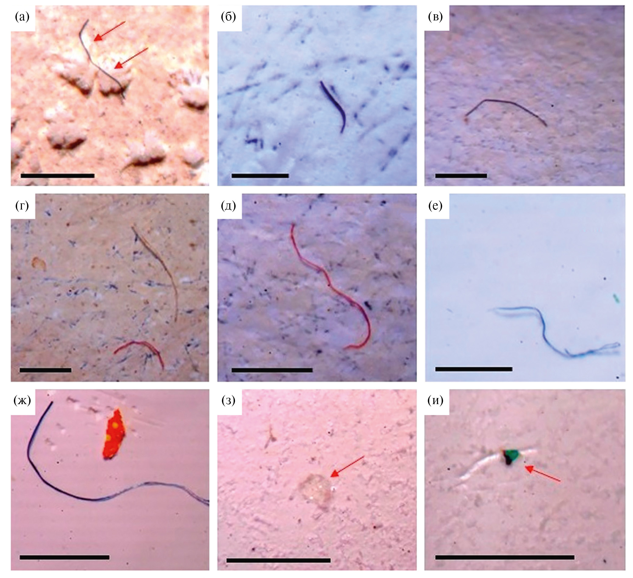 Рис. 2. Частицы микропластика, найденные в ЖКТ Abramis brama (а–в, е) и Perca fluviatilis (г, д, ж–и). Масштабная линейка равна 1 мм.