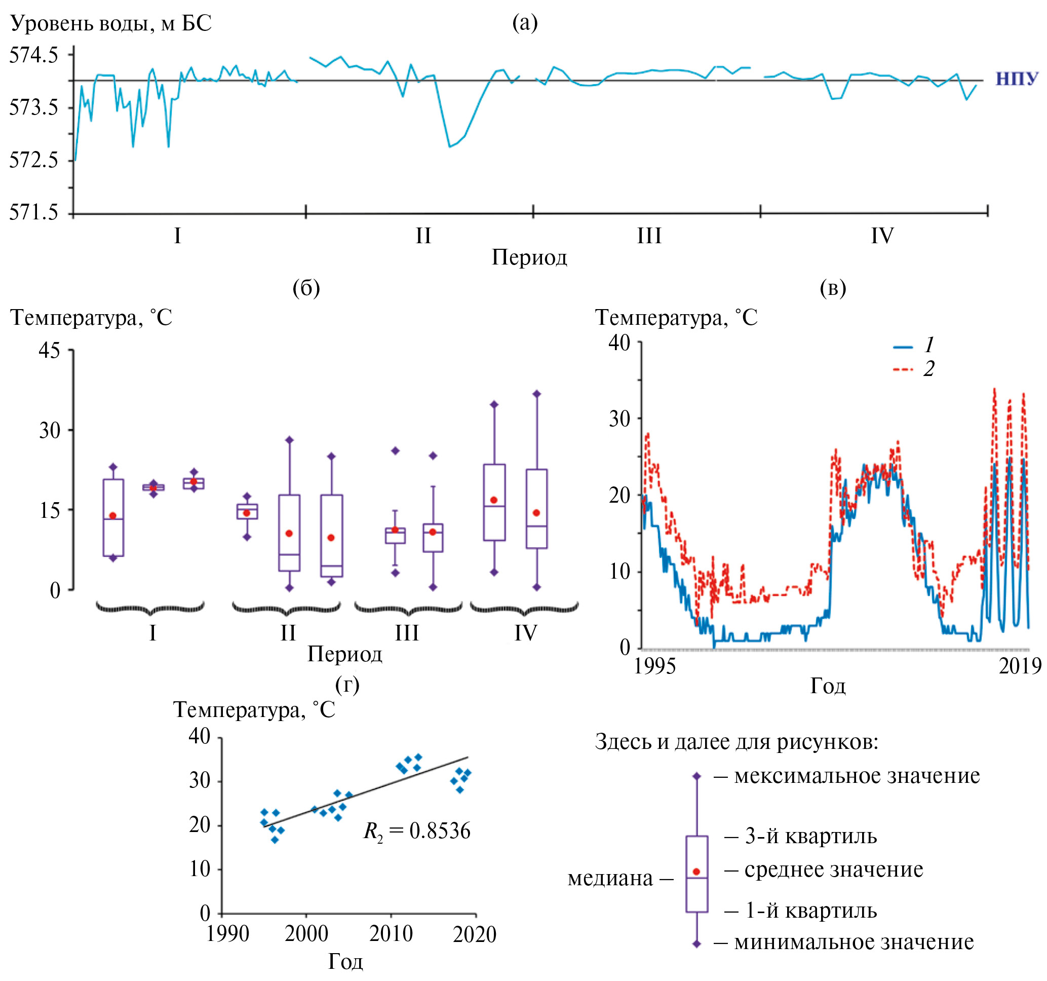 Рис. 2. Динамика среднемесячного уровня воды (а, м БС) и среднегодовой температуры воды (б) в разные периоды исследований, изменения температуры воды на входе (1) и выходе (2) из конденсатора (в), многолетняя динамика температуры воды в июле–августе на ст. 3 (г).