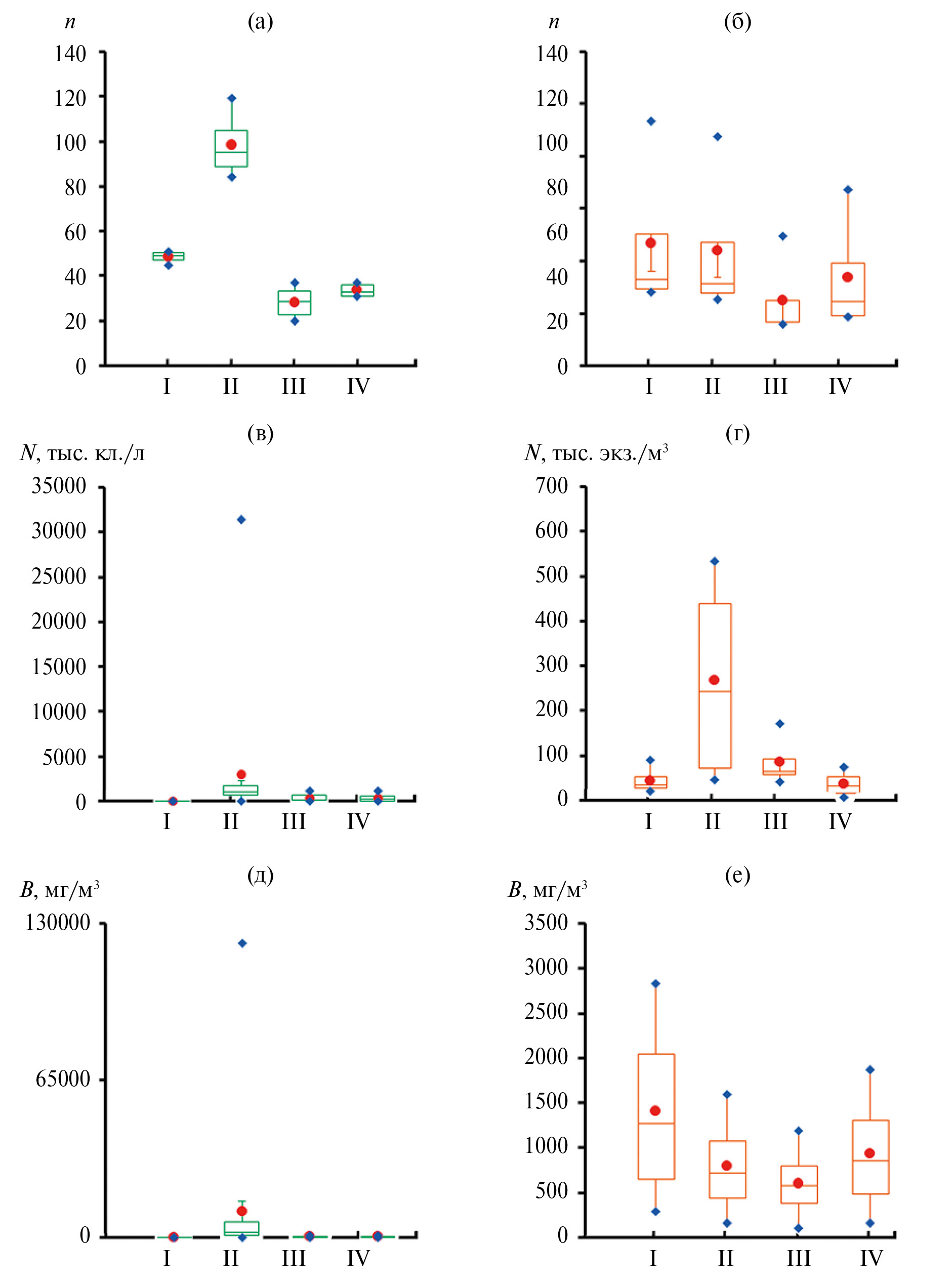 Рис. 3. Изменение структурных показателей фитопланктона (а, в, д) и зоопланктона (б, г, е) водохранилища в разные периоды исследований (I–IV): а, б — число видов, в, г — численность, д, е — биомасса.