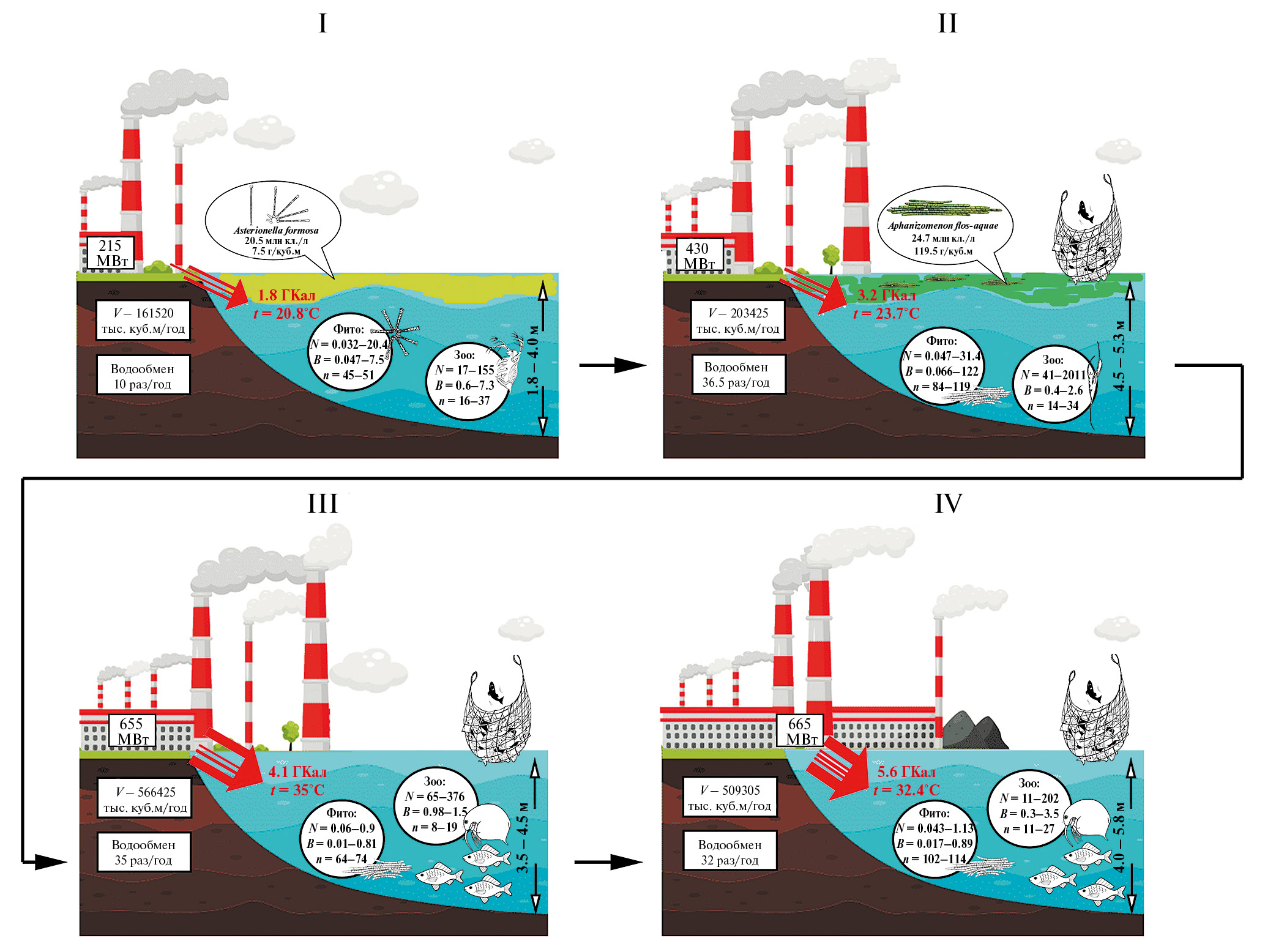 На основе результатов многолетних исследований представлена концептуальная модель (рис. 5), иллюстрирующая трансформацию планктонных биоценозов в антропогенно нагруженном водоеме вследствие увеличения мощности станции (от 215 до 665 МВт), тепловой нагрузки (от 1.8 до 5.6 Гкал), объема перекачиваемой воды (от 161 520 тыс. до 509 305 тыс. м3/год), водообмена (от 10 до 32–35 раз/год), температуры воды (от 21 до 32–35°С), изменения глубины и проведения биомелиоративных мероприятий. Периоды I–II исследований характеризовались развитием разнообразных и обильных планктонных сообществ водорослей и беспозвоночных; период III — сокращением видового богатства и количественных характеристик фито- и зоопланктона; период IV — ограниченным набором видов планктонных организмов с массовым развитием одного-двух видов.